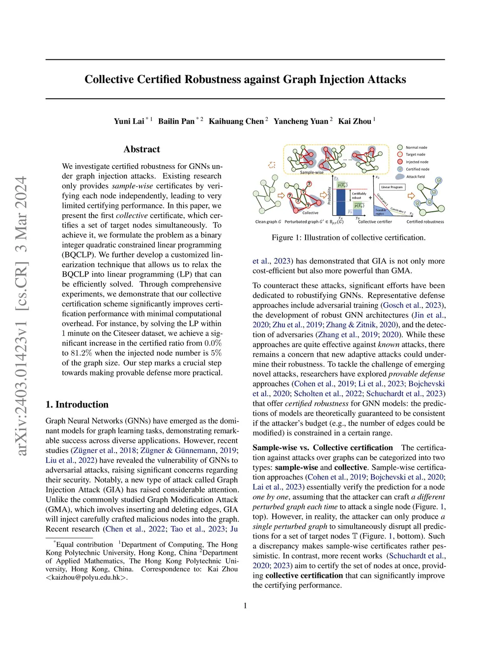 We investigate certified robustness for GNNs under graph injection attacks. Existing research only provides sample-wise certificates by verifying each node independently, leading to very limited certifying performance. In this paper, we present the first collective certificate, which certifies a set of target nodes simultaneously. To achieve it, we formulate the problem as a binary integer quadratic constrained linear programming (BQCLP). We further develop a customized linearization technique that allows us to relax the BQCLP into linear programming (LP) that can be efficiently solved. Through comprehensive experiments, we demonstrate that our collective certification scheme significantly improves certification performance with minimal computational overhead. For instance, by solving the LP within 1 minute on the Citeseer dataset, we achieve a significant increase in the certified ratio from 0.0% to 81.2% when the injected node number is 5% of the graph size. Our step marks a crucial step towards making provable defense more practical.