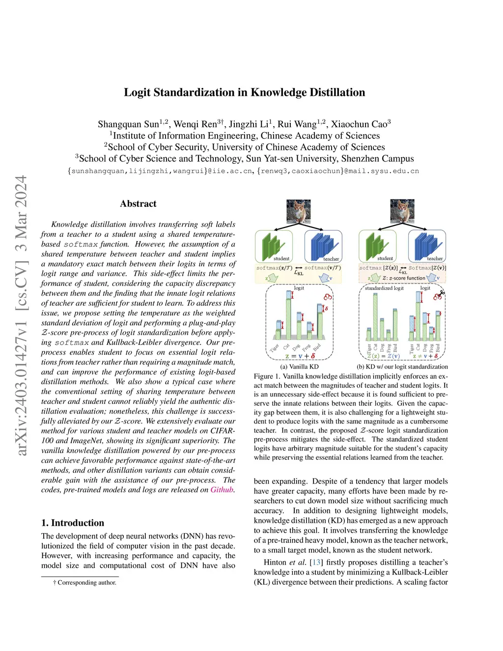 Knowledge distillation involves transferring soft labels from a teacher to a student using a shared temperature-based softmax function. However, the assumption of a shared temperature between teacher and student implies a mandatory exact match between their logits in terms of logit range and variance. This side-effect limits the performance of student, considering the capacity discrepancy between them and the finding that the innate logit relations of teacher are sufficient for student to learn. To address this issue, we propose setting the temperature as the weighted standard deviation of logit and performing a plug-and-play Z-score pre-process of logit standardization before applying softmax and Kullback-Leibler divergence. Our pre-process enables student to focus on essential logit relations from teacher rather than requiring a magnitude match, and can improve the performance of existing logit-based distillation methods. We also show a typical case where the conventional setting of sharing temperature between teacher and student cannot reliably yield the authentic distillation evaluation; nonetheless, this challenge is successfully alleviated by our Z-score. We extensively evaluate our method for various student and teacher models on CIFAR-100 and ImageNet, showing its significant superiority. The vanilla knowledge distillation powered by our pre-process can achieve favorable performance against state-of-the-art methods, and other distillation variants can obtain considerable gain with the assistance of our pre-process.
