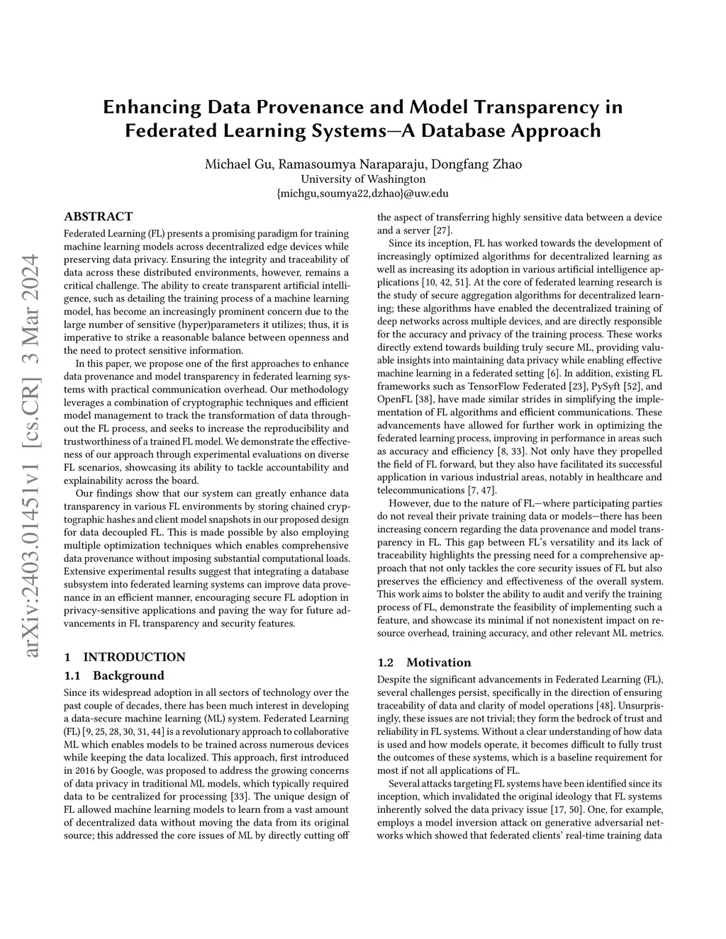 Federated Learning (FL) presents a promising paradigm for training machine learning models across decentralized edge devices while preserving data privacy. Ensuring the integrity and traceability of data across these distributed environments, however, remains a critical challenge. The ability to create transparent artificial intelligence, such as detailing the training process of a machine learning model, has become an increasingly prominent concern due to the large number of sensitive (hyper)parameters it utilizes; thus, it is imperative to strike a reasonable balance between openness and the need to protect sensitive information. In this paper, we propose one of the first approaches to enhance data provenance and model transparency in federated learning systems. Our methodology leverages a combination of cryptographic techniques and efficient model management to track the transformation of data throughout the FL process, and seeks to increase the reproducibility and trustworthiness of a trained FL model. We demonstrate the effectiveness of our approach through experimental evaluations on diverse FL scenarios, showcasing its ability to tackle accountability and explainability across the board. Our findings show that our system can greatly enhance data transparency in various FL environments by storing chained cryptographic hashes and client model snapshots in our proposed design for data decoupled FL. This is made possible by also employing multiple optimization techniques which enables comprehensive data provenance without imposing substantial computational loads. Extensive experimental results suggest that integrating a database subsystem into federated learning systems can improve data provenance in an efficient manner, encouraging secure FL adoption in privacy-sensitive applications and paving the way for future advancements in FL transparency and security features.