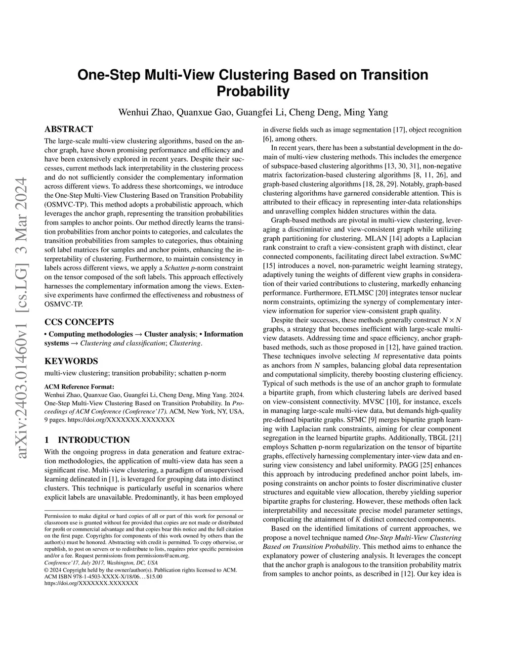 One-Step Multi-View Clustering Based on Transition Probability