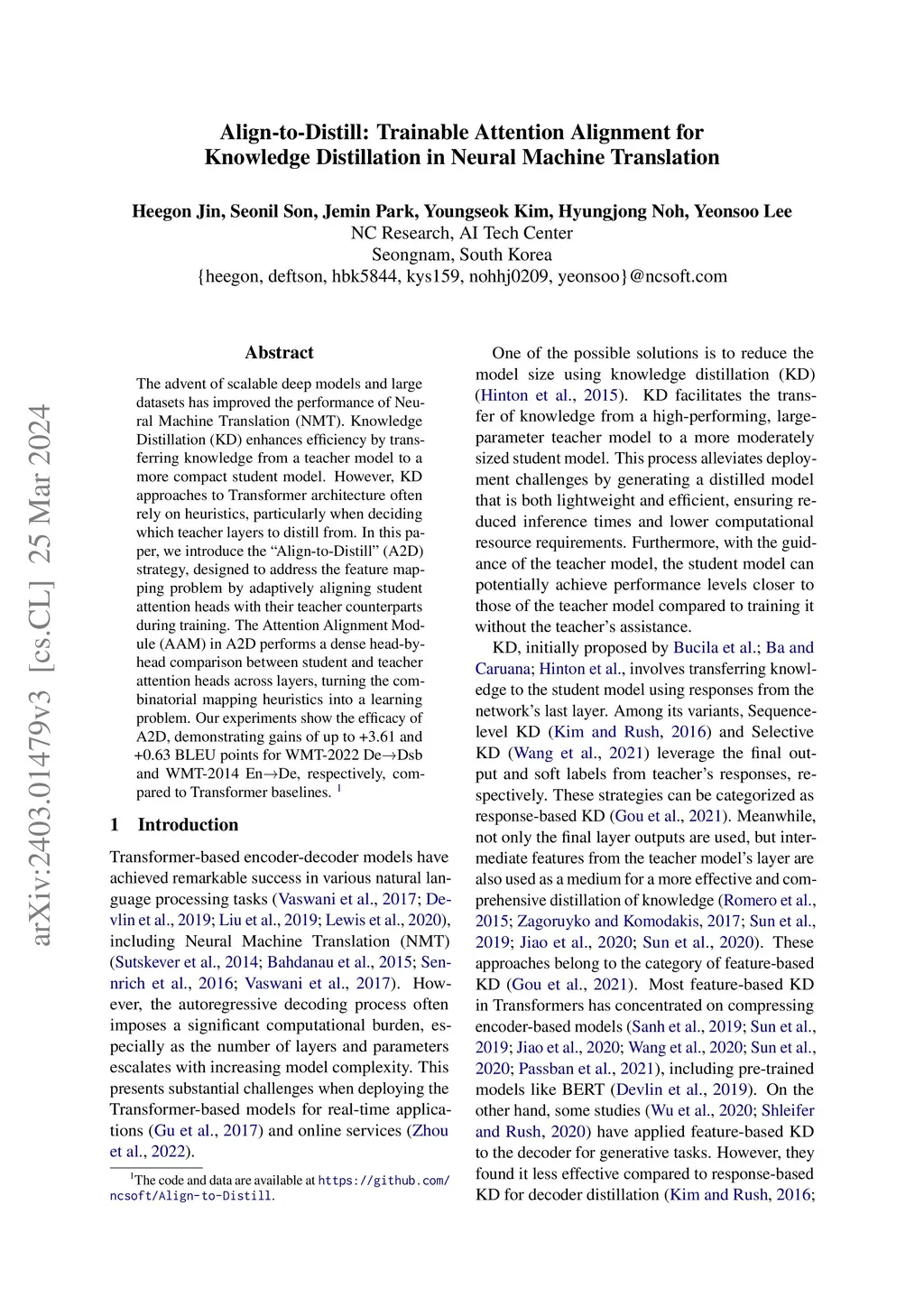 The advent of scalable deep models and large datasets has improved the performance of Neural Machine Translation. Knowledge Distillation (KD) enhances efficiency by transferring knowledge from a teacher model to a more compact student model. However, KD approaches to Transformer architecture often rely on heuristics, particularly when deciding which teacher layers to distill from. In this paper, we introduce the Álign-to-Distill' (A2D) strategy, designed to address the feature mapping problem by adaptively aligning student attention heads with their teacher counterparts during training. The Attention Alignment Module in A2D performs a dense head-by-head comparison between student and teacher attention heads across layers, turning the combinatorial mapping heuristics into a learning problem. Our experiments show the efficacy of A2D, demonstrating gains of up to +3.61 and +0.63 BLEU points for WMT-2022 De->Dsb and WMT-2014 En->De, respectively, compared to Transformer baselines.
