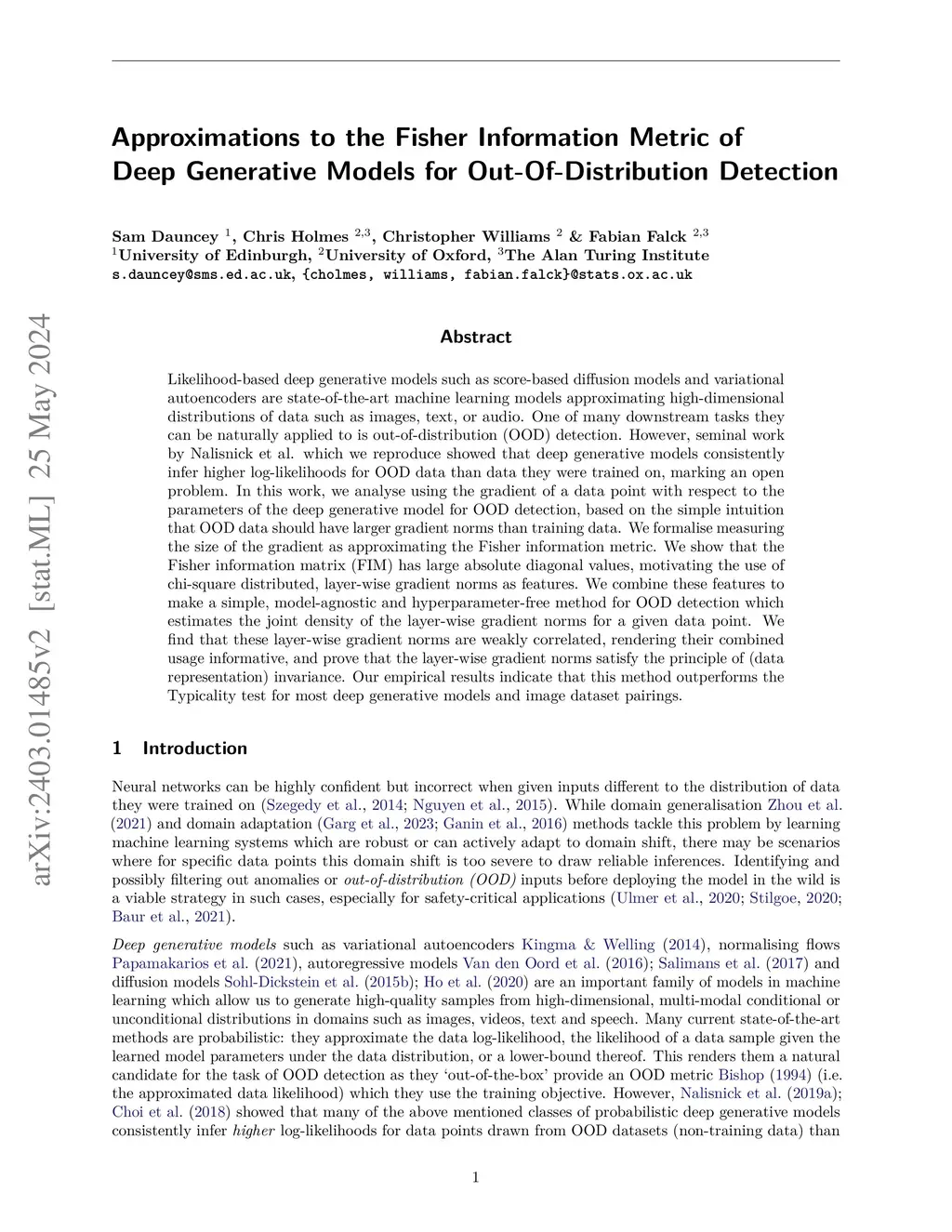 Likelihood-based deep generative models such as score-based diffusion models and variational autoencoders are state-of-the-art machine learning models approximating high-dimensional distributions of data such as images, text, or audio. One of many downstream tasks they can be naturally applied to is out-of-distribution (OOD) detection. However, seminal work by Nalisnick et al. which we reproduce showed that deep generative models consistently infer higher log-likelihoods for OOD data than data they were trained on, marking an open problem. In this work, we analyse using the gradient of a data point with respect to the parameters of the deep generative model for OOD detection, based on the simple intuition that OOD data should have larger gradient norms than training data. We formalise measuring the size of the gradient as approximating the Fisher information metric. We show that the Fisher information matrix (FIM) has large absolute diagonal values, motivating the use of chi-square distributed, layer-wise gradient norms as features. We combine these features to make a simple, model-agnostic and hyperparameter-free method for OOD detection which estimates the joint density of the layer-wise gradient norms for a given data point. We find that these layer-wise gradient norms are weakly correlated, rendering their combined usage informative, and prove that the layer-wise gradient norms satisfy the principle of (data representation) invariance. Our empirical results indicate that this method outperforms the Typicality test for most deep generative models and image dataset pairings.