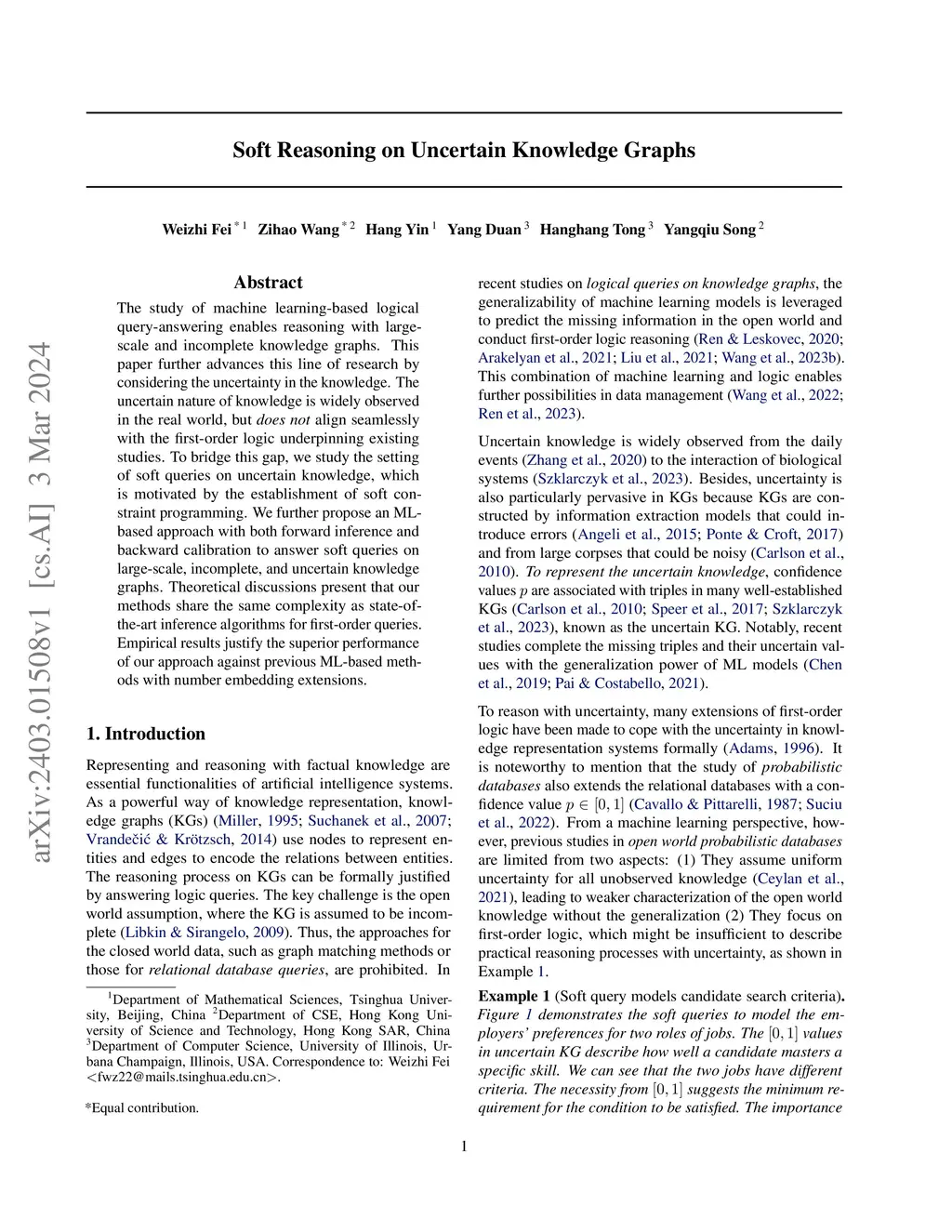 The study of machine learning-based logical query answering enables reasoning with large-scale and incomplete knowledge graphs. This paper advances this area of research by addressing the uncertainty inherent in knowledge. While the uncertain nature of knowledge is widely recognized in the real world, it does not align seamlessly with the first-order logic that underpins existing studies. To bridge this gap, we explore the soft queries on uncertain knowledge, inspired by the framework of soft constraint programming. We propose a neural symbolic approach that incorporates both forward inference and backward calibration to answer soft queries on large-scale, incomplete, and uncertain knowledge graphs. Theoretical discussions demonstrate that our method avoids catastrophic cascading errors in the forward inference while maintaining the same complexity as state-of-the-art symbolic methods for complex logical queries. Empirical results validate the superior performance of our backward calibration compared to extended query embedding methods and neural symbolic approaches.