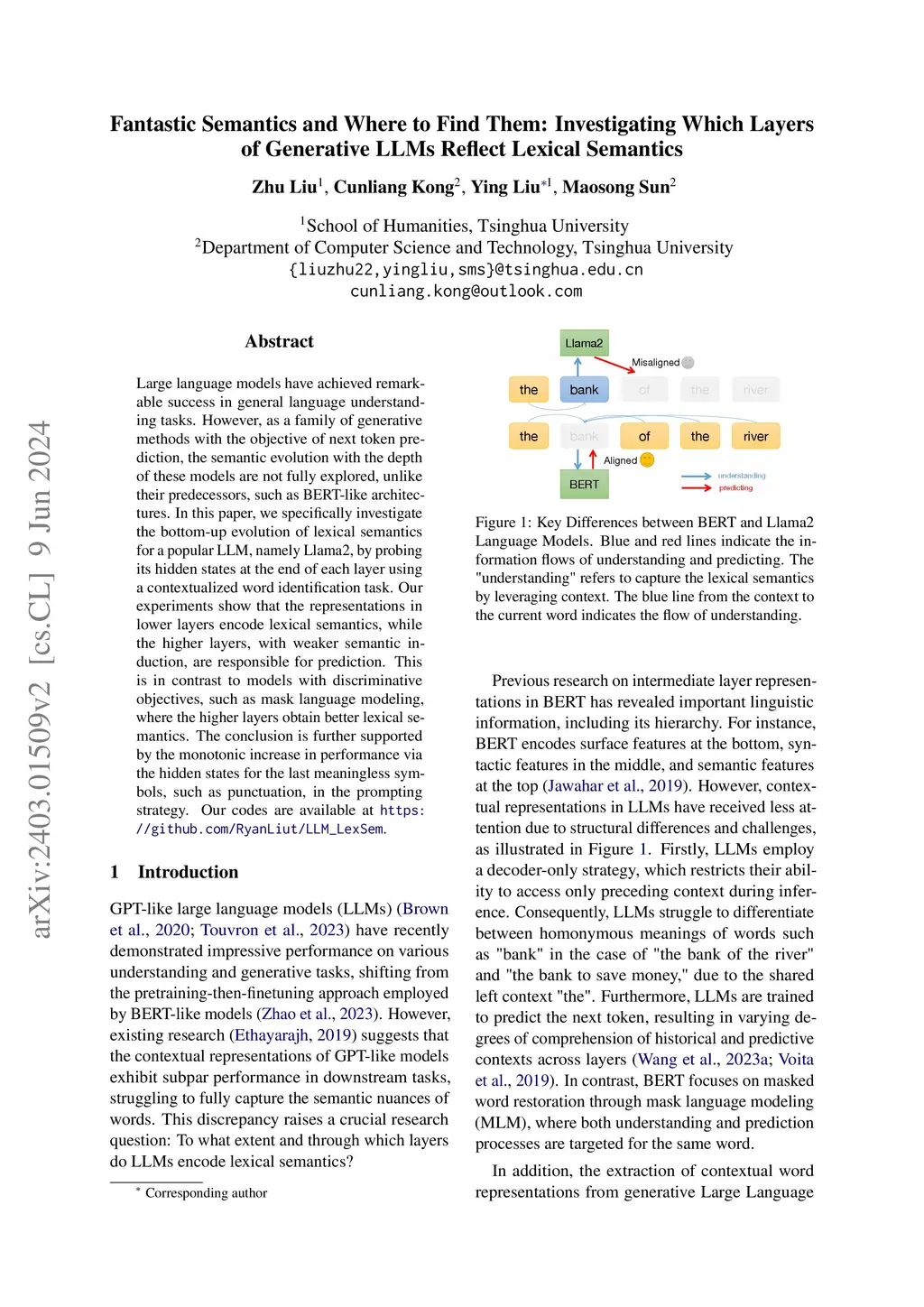 Large language models have achieved remarkable success in general language understanding tasks. However, as a family of generative methods with the objective of next token prediction, the semantic evolution with the depth of these models are not fully explored, unlike their predecessors, such as BERT-like architectures. In this paper, we specifically investigate the bottom-up evolution of lexical semantics for a popular LLM, namely Llama2, by probing its hidden states at the end of each layer using a contextualized word identification task. Our experiments show that the representations in lower layers encode lexical semantics, while the higher layers, with weaker semantic induction, are responsible for prediction. This is in contrast to models with discriminative objectives, such as mask language modeling, where the higher layers obtain better lexical semantics. The conclusion is further supported by the monotonic increase in performance via the hidden states for the last meaningless symbols, such as punctuation, in the prompting strategy.