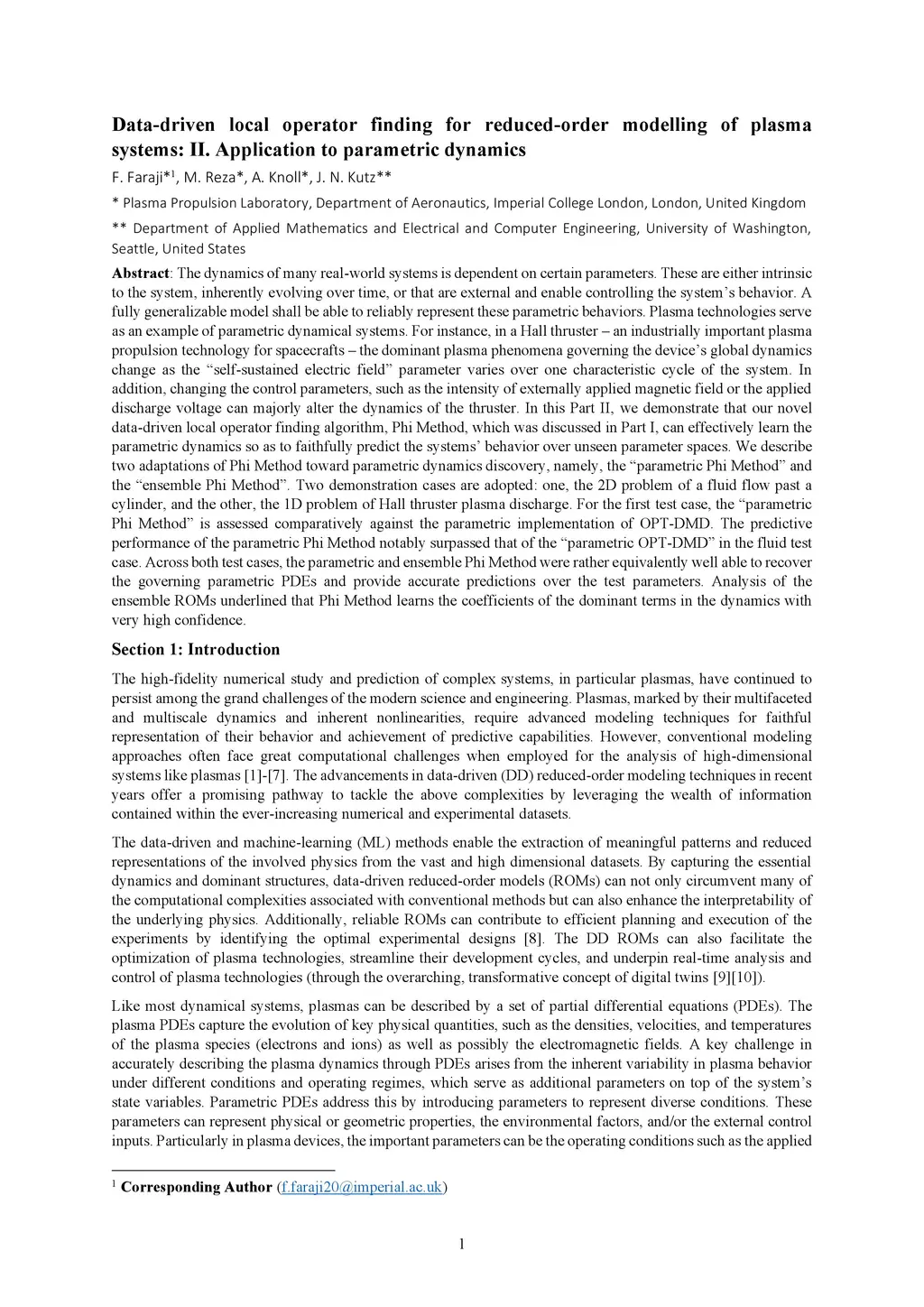 Real-world systems often exhibit dynamics influenced by various parameters, either inherent or externally controllable, necessitating models capable of reliably capturing these parametric behaviors. Plasma technologies exemplify such systems. For example, phenomena governing global dynamics in Hall thrusters (a spacecraft propulsion technology) vary with various parameters, such as the "self-sustained electric field". In this Part II, following on the introduction of our novel data-driven local operator finding algorithm, Phi Method, in Part I, we showcase the method's effectiveness in learning parametric dynamics to predict system behavior across unseen parameter spaces. We present two adaptations: the "parametric Phi Method" and the "ensemble Phi Method", which are demonstrated through 2D fluid-flow-past-a-cylinder and 1D Hall-thruster-plasma-discharge problems. Comparative evaluation against parametric OPT-DMD in the fluid case demonstrates superior predictive performance of the parametric Phi Method. Across both test cases, parametric and ensemble Phi Method reliably recover governing parametric PDEs and offer accurate predictions over test parameters. Ensemble ROM analysis underscores Phi Method's robust learning of dominant dynamic coefficients with high confidence.