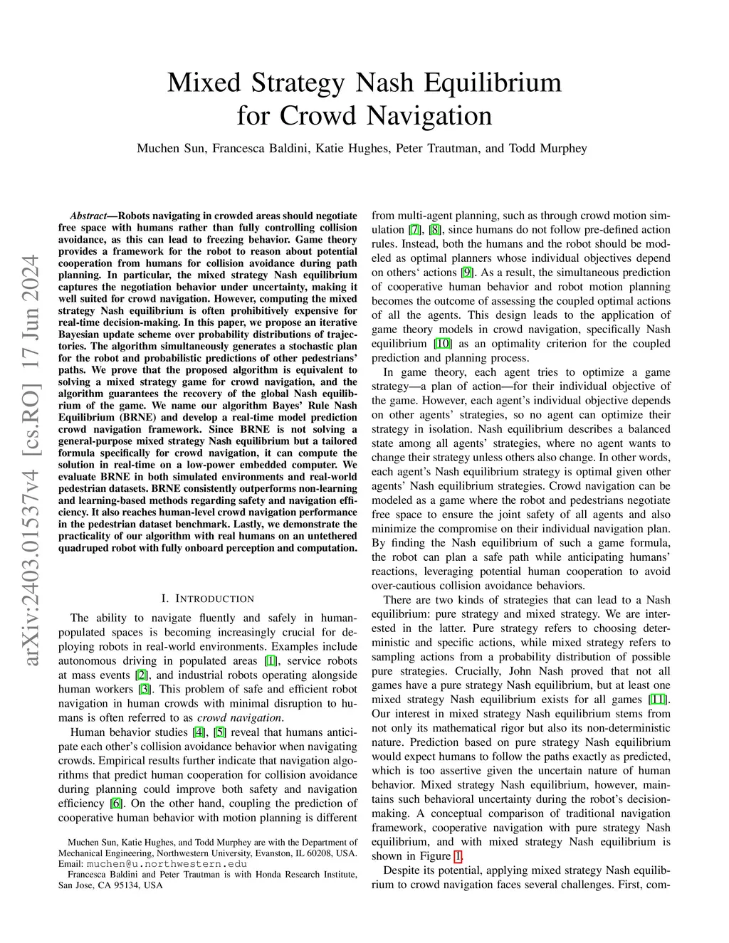 Robots navigating in crowded areas should negotiate free space with humans rather than fully controlling collision avoidance, as this can lead to freezing behavior. Game theory provides a framework for the robot to reason about potential cooperation from humans for collision avoidance during path planning. In particular, the mixed strategy Nash equilibrium captures the negotiation behavior under uncertainty, making it well suited for crowd navigation. However, computing the mixed strategy Nash equilibrium is often prohibitively expensive for real-time decision-making. In this paper, we propose an iterative Bayesian update scheme over probability distributions of trajectories. The algorithm simultaneously generates a stochastic plan for the robot and probabilistic predictions of other pedestrians' paths. We prove that the proposed algorithm is equivalent to solving a mixed strategy game for crowd navigation, and the algorithm guarantees the recovery of the global Nash equilibrium of the game. We name our algorithm Bayes' Rule Nash Equilibrium (BRNE) and develop a real-time model prediction crowd navigation framework. Since BRNE is not solving a general-purpose mixed strategy Nash equilibrium but a tailored formula specifically for crowd navigation, it can compute the solution in real-time on a low-power embedded computer. We evaluate BRNE in both simulated environments and real-world pedestrian datasets. BRNE consistently outperforms non-learning and learning-based methods regarding safety and navigation efficiency. It also reaches human-level crowd navigation performance in the pedestrian dataset benchmark. Lastly, we demonstrate the practicality of our algorithm with real humans on an untethered quadruped robot with fully onboard perception and computation.
