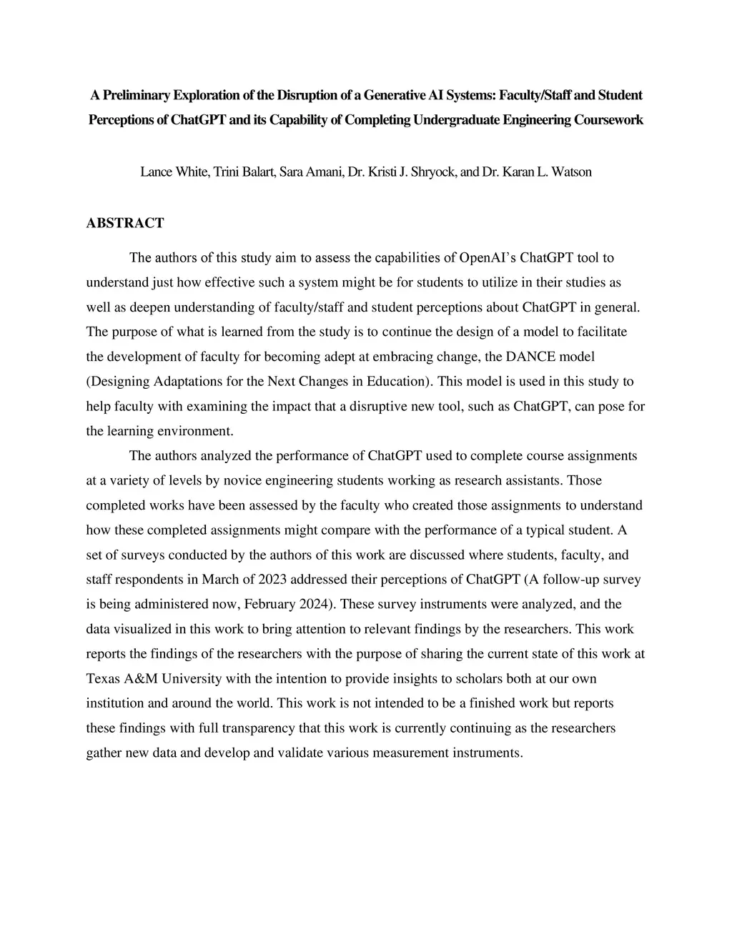 The authors of this study aim to assess the capabilities of the OpenAI ChatGPT tool to understand just how effective such a system might be for students to utilize in their studies as well as deepen understanding of faculty/staff and student perceptions about ChatGPT in general. The purpose of what is learned from the study is to continue the design of a model to facilitate the development of faculty for becoming adept at embracing change, the DANCE model (Designing Adaptations for the Next Changes in Education). This model is used in this study to help faculty with examining the impact that a disruptive new tool, such as ChatGPT, can pose for the learning environment. The authors analyzed the performance of ChatGPT used to complete course assignments at a variety of levels by novice engineering students working as research assistants. Those completed works have been assessed by the faculty who created those assignments to understand how these completed assignments might compare with the performance of a typical student. A set of surveys conducted by the authors of this work are discussed where students, faculty, and staff respondents in March of 2023 addressed their perceptions of ChatGPT (A follow-up survey is being administered now, February 2024). These survey instruments were analyzed, and the data visualized in this work to bring attention to relevant findings by the researchers. This work reports the findings of the researchers with the purpose of sharing the current state of this work at Texas A&M University with the intention to provide insights to scholars both at our own institution and around the world. This work is not intended to be a finished work but reports these findings with full transparency that this work is currently continuing as the researchers gather new data and develop and validate various measurement instruments.