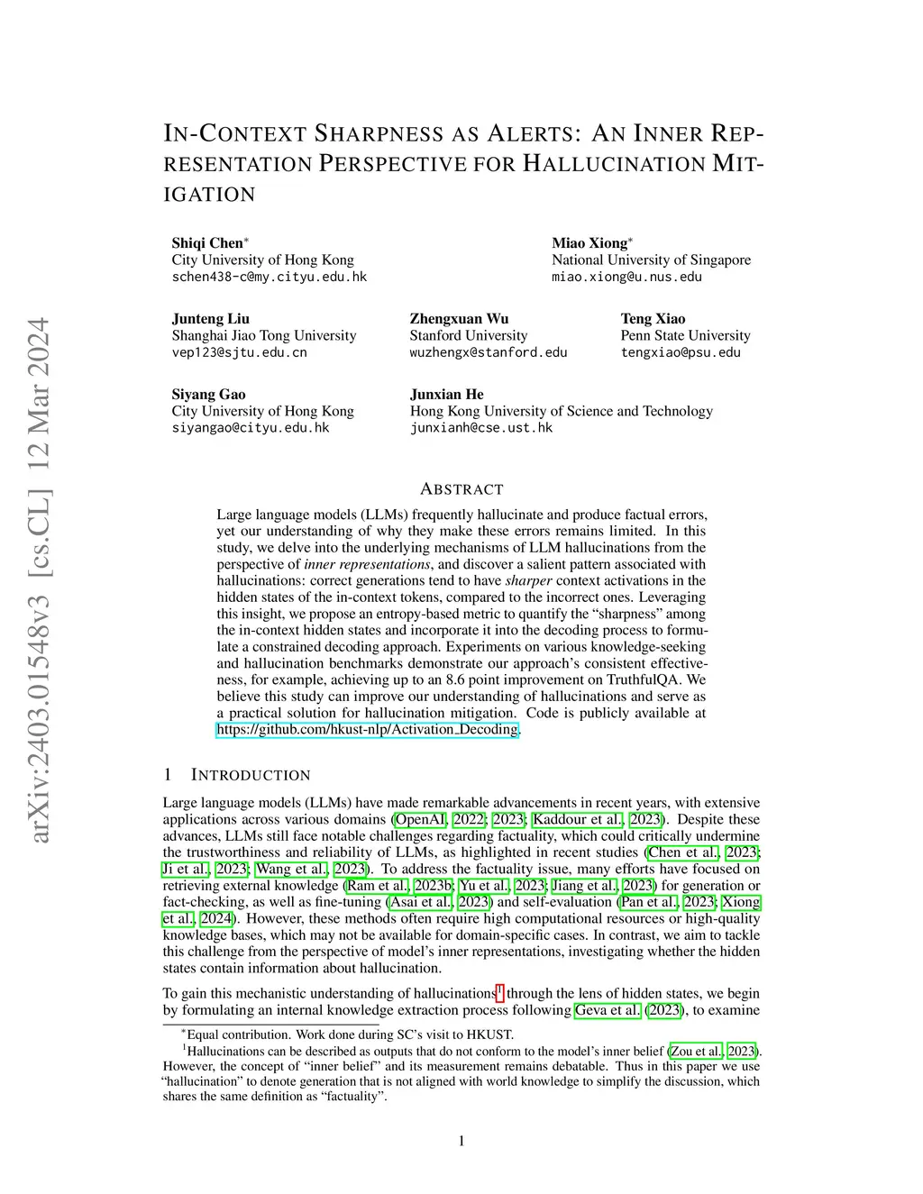Large language models (LLMs) frequently hallucinate and produce factual errors, yet our understanding of why they make these errors remains limited. In this study, we delve into the underlying mechanisms of LLM hallucinations from the perspective of inner representations, and discover a salient pattern associated with hallucinations: correct generations tend to have sharper context activations in the hidden states of the in-context tokens, compared to the incorrect ones. Leveraging this insight, we propose an entropy-based metric to quantify the ``sharpness'' among the in-context hidden states and incorporate it into the decoding process to formulate a constrained decoding approach. Experiments on various knowledge-seeking and hallucination benchmarks demonstrate our approach's consistent effectiveness, for example, achieving up to an 8.6 point improvement on TruthfulQA. We believe this study can improve our understanding of hallucinations and serve as a practical solution for hallucination mitigation.