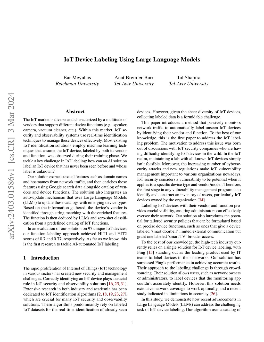 The IoT market is diverse and characterized by a multitude of vendors that support different device functions (e.g., speaker, camera, vacuum cleaner, etc.). Within this market, IoT security and observability systems use real-time identification techniques to manage these devices effectively. Most existing IoT identification solutions employ machine learning techniques that assume the IoT device, labeled by both its vendor and function, was observed during their training phase. We tackle a key challenge in IoT labeling: how can an AI solution label an IoT device that has never been seen before and whose label is unknown? Our solution extracts textual features such as domain names and hostnames from network traffic, and then enriches these features using Google search data alongside catalog of vendors and device functions. The solution also integrates an auto-update mechanism that uses Large Language Models (LLMs) to update these catalogs with emerging device types. Based on the information gathered, the device's vendor is identified through string matching with the enriched features. The function is then deduced by LLMs and zero-shot classification from a predefined catalog of IoT functions. In an evaluation of our solution on 97 unique IoT devices, our function labeling approach achieved HIT1 and HIT2 scores of 0.7 and 0.77, respectively. As far as we know, this is the first research to tackle AI-automated IoT labeling.
