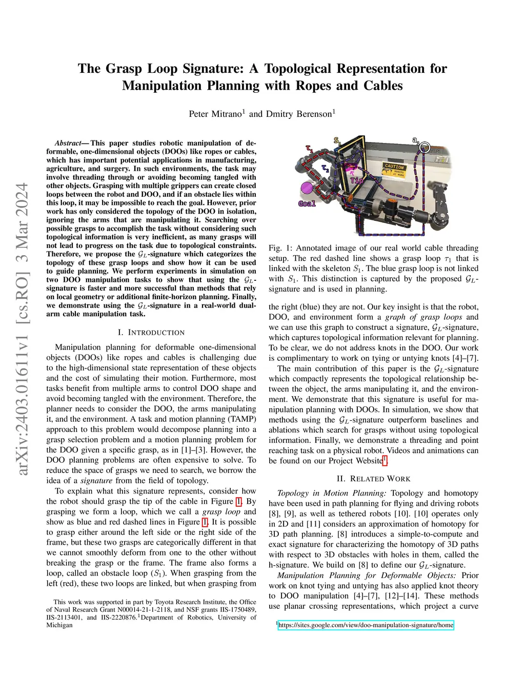 Robotic manipulation of deformable, one-dimensional objects (DOOs) like ropes or cables has important potential applications in manufacturing, agriculture, and surgery. In such environments, the task may involve threading through or avoiding becoming tangled with objects like racks or frames. Grasping with multiple grippers can create closed loops between the robot and DOO, and If an obstacle lies within this loop, it may be impossible to reach the goal. However, prior work has only considered the topology of the DOO in isolation, ignoring the arms that are manipulating it. Searching over possible grasps to accomplish the task without considering such topological information is very inefficient, as many grasps will not lead to progress on the task due to topological constraints. Therefore, we propose a grasp loop signature which categorizes the topology of these grasp loops and show how it can be used to guide planning. We perform experiments in simulation on two DOO manipulation tasks to show that using the signature is faster and succeeds more often than methods that rely on local geometry or finite-horizon planning. Finally, we demonstrate using the signature in the real world to manipulate a cable in a scene with obstacles using a dual-arm robot.