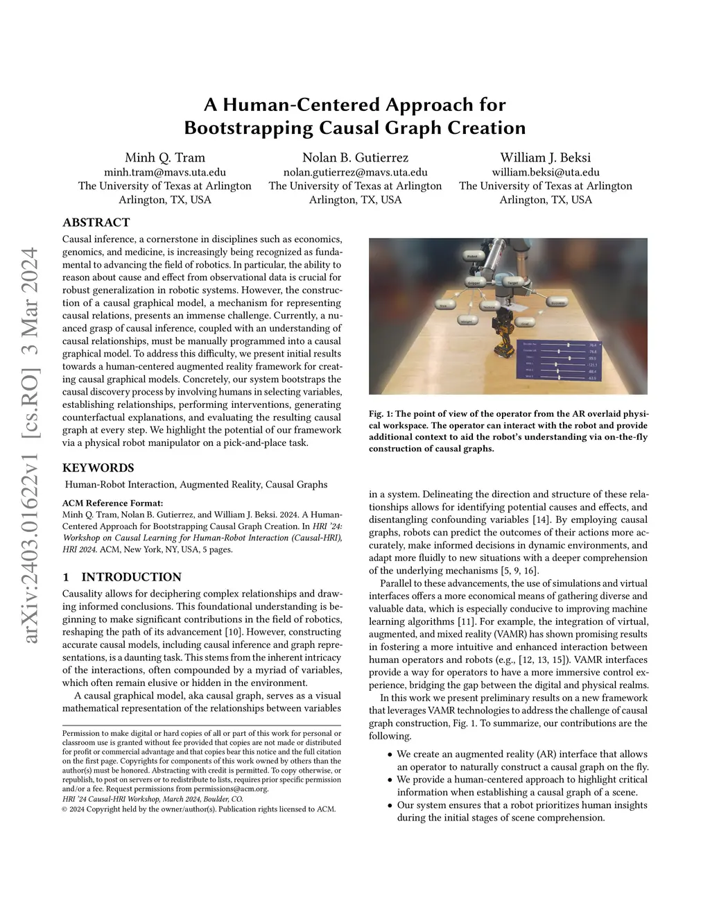 Causal inference, a cornerstone in disciplines such as economics, genomics, and medicine, is increasingly being recognized as fundamental to advancing the field of robotics. In particular, the ability to reason about cause and effect from observational data is crucial for robust generalization in robotic systems. However, the construction of a causal graphical model, a mechanism for representing causal relations, presents an immense challenge. Currently, a nuanced grasp of causal inference, coupled with an understanding of causal relationships, must be manually programmed into a causal graphical model. To address this difficulty, we present initial results towards a human-centered augmented reality framework for creating causal graphical models. Concretely, our system bootstraps the causal discovery process by involving humans in selecting variables, establishing relationships, performing interventions, generating counterfactual explanations, and evaluating the resulting causal graph at every step. We highlight the potential of our framework via a physical robot manipulator on a pick-and-place task.