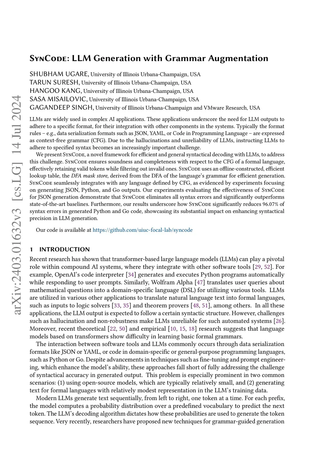 SynCode: LLM Generation with Grammar Augmentation
