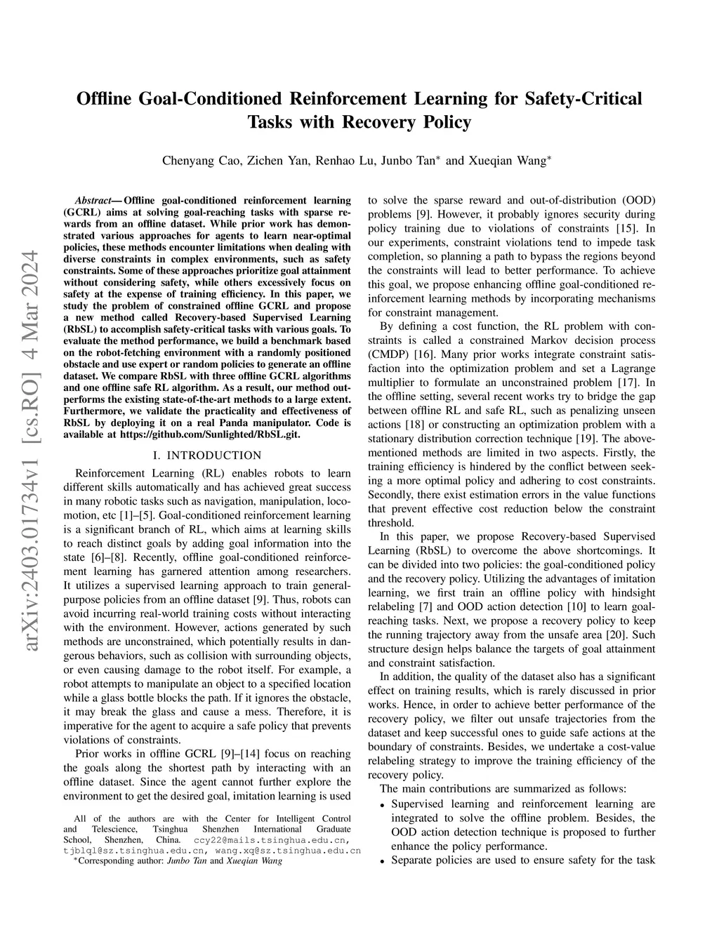 Offline goal-conditioned reinforcement learning (GCRL) aims at solving goal-reaching tasks with sparse rewards from an offline dataset. While prior work has demonstrated various approaches for agents to learn near-optimal policies, these methods encounter limitations when dealing with diverse constraints in complex environments, such as safety constraints. Some of these approaches prioritize goal attainment without considering safety, while others excessively focus on safety at the expense of training efficiency. In this paper, we study the problem of constrained offline GCRL and propose a new method called Recovery-based Supervised Learning (RbSL) to accomplish safety-critical tasks with various goals. To evaluate the method performance, we build a benchmark based on the robot-fetching environment with a randomly positioned obstacle and use expert or random policies to generate an offline dataset. We compare RbSL with three offline GCRL algorithms and one offline safe RL algorithm. As a result, our method outperforms the existing state-of-the-art methods to a large extent. Furthermore, we validate the practicality and effectiveness of RbSL by deploying it on a real Panda manipulator. Code is available at https://github.com/Sunlighted/RbSL.git.