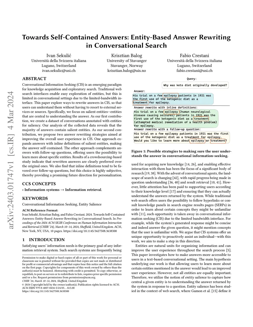 Conversational information-seeking (CIS) is an emerging paradigm for knowledge acquisition and exploratory search. Traditional web search interfaces enable easy exploration of entities, but this is limited in conversational settings due to the limited-bandwidth interface. This paper explore ways to rewrite answers in CIS, so that users can understand them without having to resort to external services or sources. Specifically, we focus on salient entities -- entities that are central to understanding the answer. As our first contribution, we create a dataset of conversations annotated with entities for saliency. Our analysis of the collected data reveals that the majority of answers contain salient entities. As our second contribution, we propose two answer rewriting strategies aimed at improving the overall user experience in CIS. One approach expands answers with inline definitions of salient entities, making the answer self-contained. The other approach complements answers with follow-up questions, offering users the possibility to learn more about specific entities. Results of a crowdsourcing-based study indicate that rewritten answers are clearly preferred over the original ones. We also find that inline definitions tend to be favored over follow-up questions, but this choice is highly subjective, thereby providing a promising future direction for personalization.