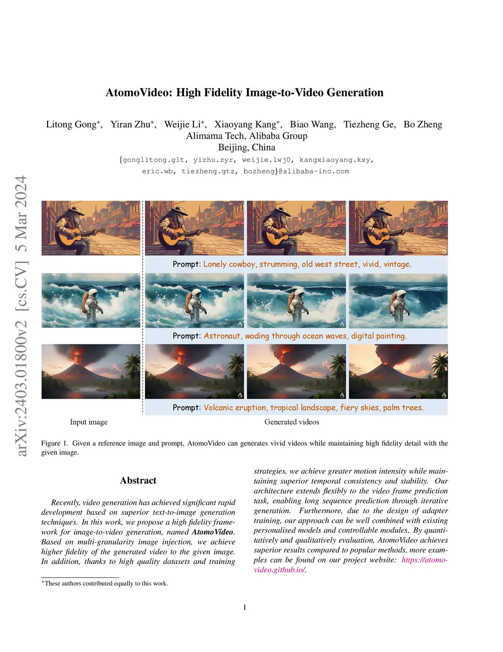 Recently, video generation has achieved significant rapid development based on superior text-to-image generation techniques. In this work, we propose a high fidelity framework for image-to-video generation, named AtomoVideo. Based on multi-granularity image injection, we achieve higher fidelity of the generated video to the given image. In addition, thanks to high quality datasets and training strategies, we achieve greater motion intensity while maintaining superior temporal consistency and stability. Our architecture extends flexibly to the video frame prediction task, enabling long sequence prediction through iterative generation. Furthermore, due to the design of adapter training, our approach can be well combined with existing personalized models and controllable modules. By quantitatively and qualitatively evaluation, AtomoVideo achieves superior results compared to popular methods, more examples can be found on our project website: https://atomo-video.github.io/.