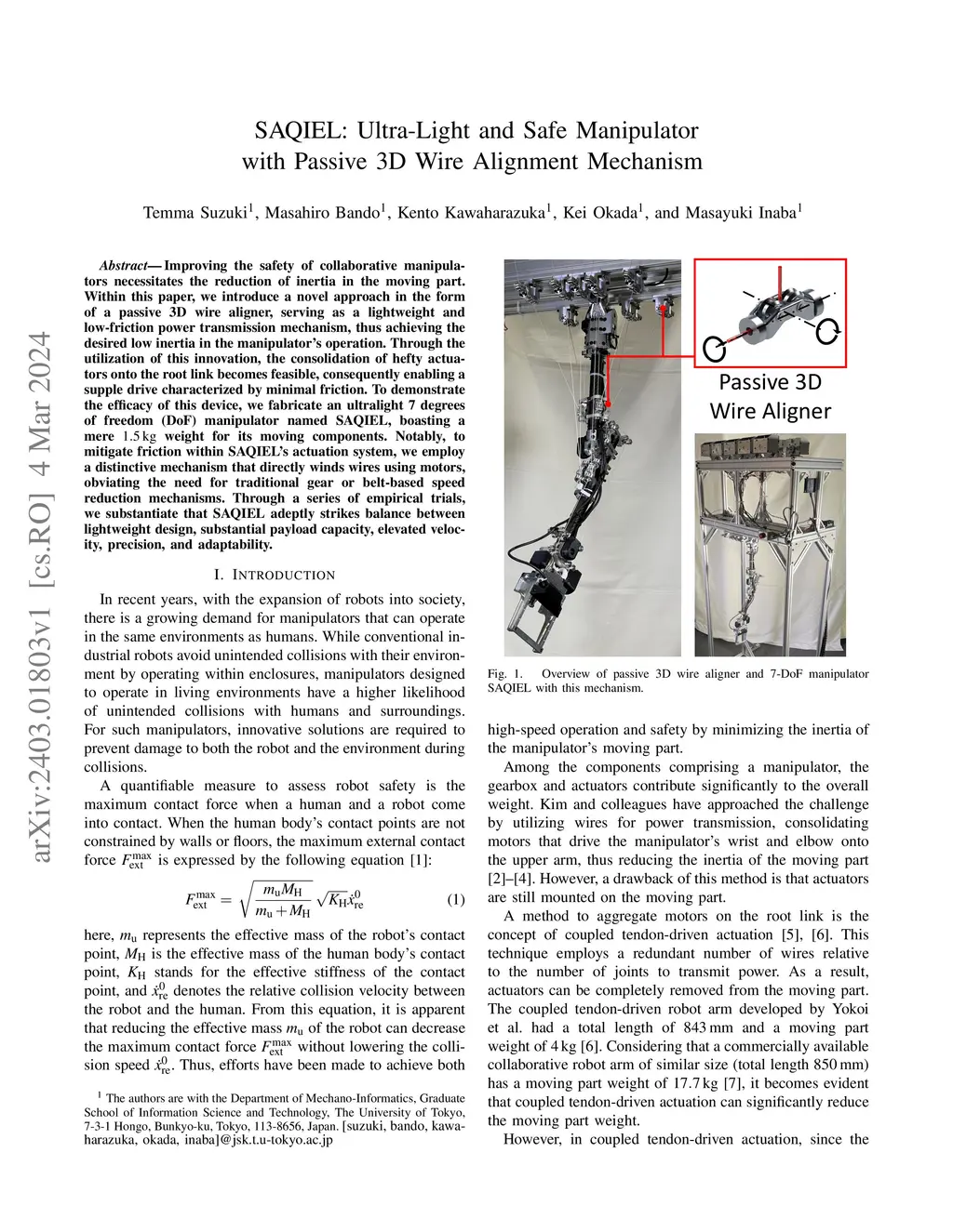 SAQIEL: Ultra-Light and Safe Manipulator with Passive 3D Wire Alignment