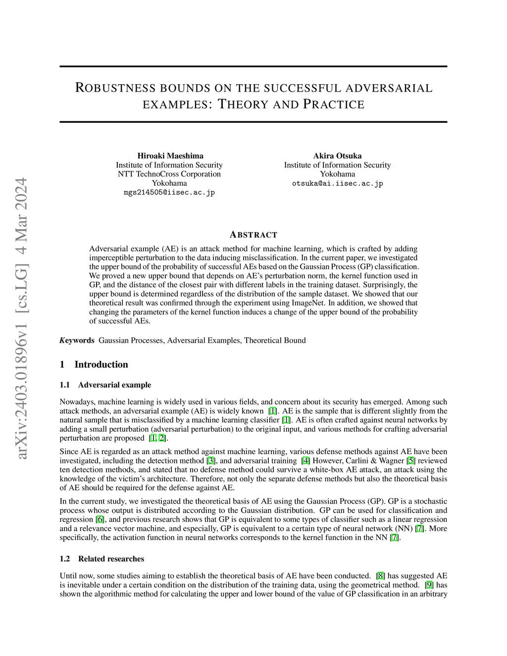 Adversarial example (AE) is an attack method for machine learning, which is crafted by adding imperceptible perturbation to the data inducing misclassification. In the current paper, we investigated the upper bound of the probability of successful AEs based on the Gaussian Process (GP) classification, a probabilistic inference model. We proved a new upper bound of the probability of a successful AE attack that depends on AE's perturbation norm, the kernel function used in GP, and the distance of the closest pair with different labels in the training dataset. Surprisingly, the upper bound is determined regardless of the distribution of the sample dataset. We showed that our theoretical result was confirmed through the experiment using ImageNet. In addition, we showed that changing the parameters of the kernel function induces a change of the upper bound of the probability of successful AEs.