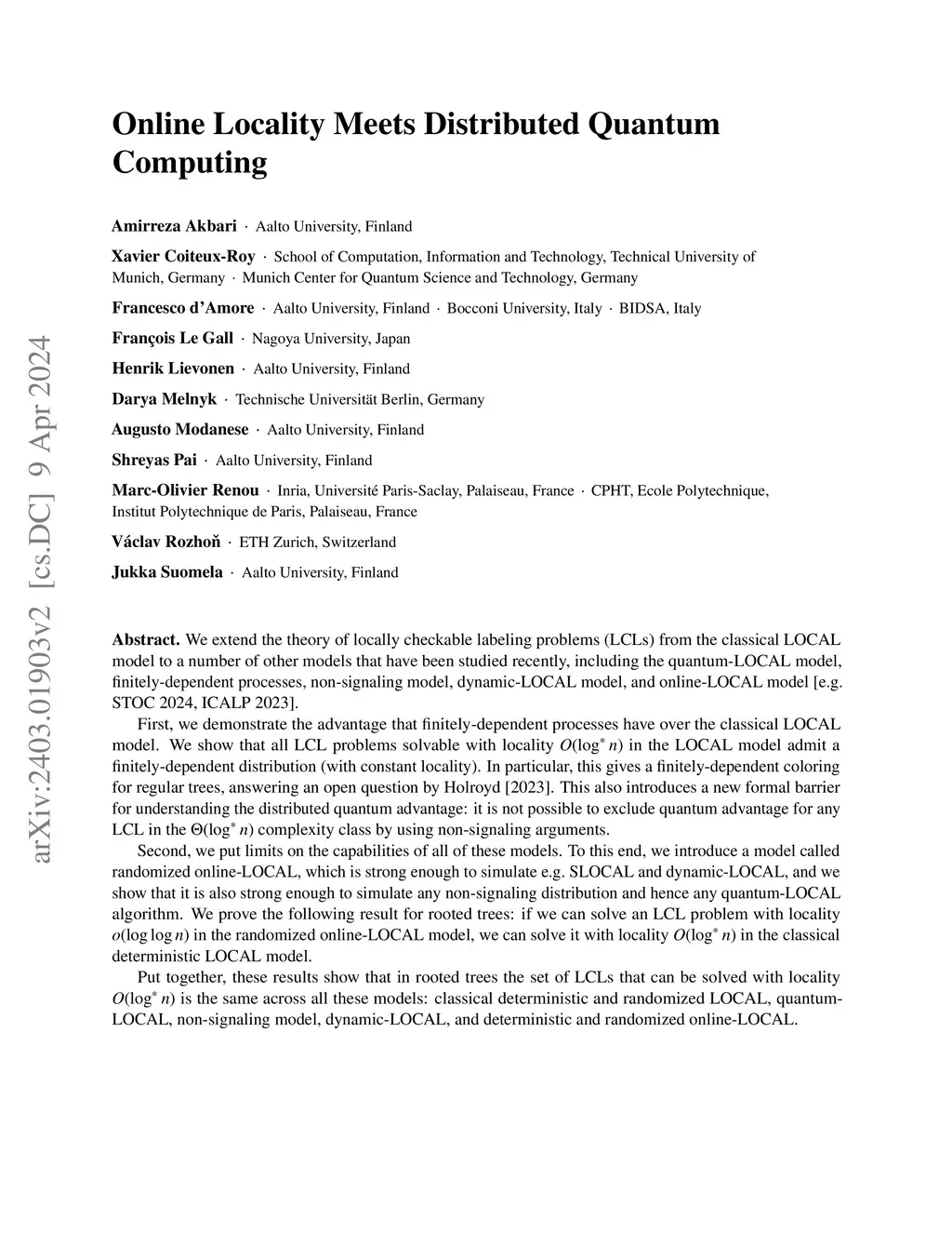 We extend the theory of locally checkable labeling problems (LCLs) from the classical LOCAL model to a number of other models that have been studied recently, including the quantum-LOCAL model, finitely-dependent processes, non-signaling model, dynamic-LOCAL model, and online-LOCAL model [e.g. STOC 2024, ICALP 2023]. First, we demonstrate the advantage that finitely-dependent processes have over the classical LOCAL model. We show that all LCL problems solvable with locality in the LOCAL model admit a finitely-dependent distribution (with constant locality). In particular, this gives a finitely-dependent coloring for regular trees, answering an open question by Holroyd [2023]. This also introduces a new formal barrier for understanding the distributed quantum advantage: it is not possible to exclude quantum advantage for any LCL in the complexity class by using non-signaling arguments. Second, we put limits on the capabilities of all of these models. To this end, we introduce a model called randomized online-LOCAL, which is strong enough to simulate e.g. SLOCAL and dynamic-LOCAL, and we show that it is also strong enough to simulate any non-signaling distribution and hence any quantum-LOCAL algorithm. We prove the following result for rooted trees: if we can solve an LCL problem with locality in the randomized online-LOCAL model, we can solve it with locality in the classical deterministic LOCAL model. Put together, these results show that in rooted trees the set of LCLs that can be solved with locality is the same across all these models: classical deterministic and randomized LOCAL, quantum-LOCAL, non-signaling model, dynamic-LOCAL, and deterministic and randomized online-LOCAL.