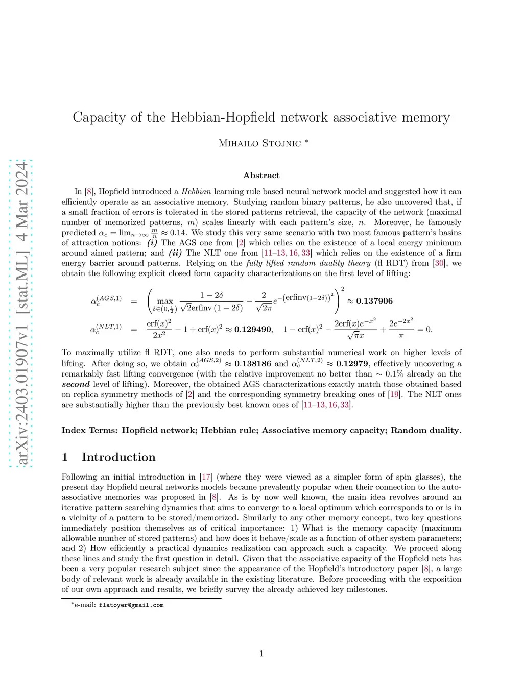 In \cite{Hop82}, Hopfield introduced a \emph{Hebbian} learning rule based neural network model and suggested how it can efficiently operate as an associative memory. Studying random binary patterns, he also uncovered that, if a small fraction of errors is tolerated in the stored patterns retrieval, the capacity of the network (maximal number of memorized patterns, ) scales linearly with each pattern's size, . Moreover, he famously predicted . We study this very same scenario with two famous pattern's basins of attraction: \textbf{\emph{(i)}} The AGS one from \cite{AmiGutSom85}; and \textbf{\emph{(ii)}} The NLT one from \cite{Newman88,Louk94,Louk94a,Louk97,Tal98}. Relying on the \emph{fully lifted random duality theory} (fl RDT) from \cite{Stojnicflrdt23}, we obtain the following explicit capacity characterizations on the first level of lifting: \begin{equation} \alpha_c^{(AGS,1)} = \left ( \max_{\delta\in \left ( 0,\frac{1}{2}\right ) }\frac{1-2\delta}{\sqrt{2} \mbox{erfinv} \left ( 1-2\delta\right )} - \frac{2}{\sqrt{2\pi}} e^{-\left ( \mbox{erfinv}\left ( 1-2\delta \right )\right )^2}\right )^2 \approx \mathbf{0.137906} \end{equation} \begin{equation} \alpha_c^{(NLT,1)} = \frac{\mbox{erf}(x)^2}{2x^2}-1+\mbox{erf}(x)^2 \approx \mathbf{0.129490}, \quad 1-\mbox{erf}(x)^2- \frac{2\mbox{erf}(x)e^{-x^2}}{\sqrt{\pi}x}+\frac{2e^{-2x^2}}{\pi}=0. \end{equation} A substantial numerical work gives on the second level of lifting and , effectively uncovering a remarkably fast lifting convergence. Moreover, the obtained AGS characterizations exactly match the replica symmetry based ones of \cite{AmiGutSom85} and the corresponding symmetry breaking ones of \cite{SteKuh94}.