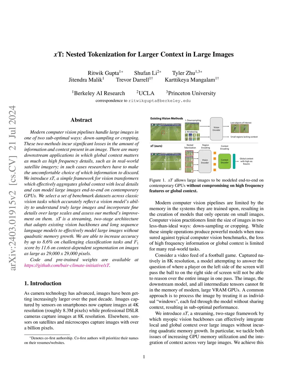 Modern computer vision pipelines handle large images in one of two sub-optimal ways: down-sampling or cropping. These two methods incur significant losses in the amount of information and context present in an image. There are many downstream applications in which global context matters as much as high frequency details, such as in real-world satellite imagery; in such cases researchers have to make the uncomfortable choice of which information to discard. We introduce xT, a simple framework for vision transformers which effectively aggregates global context with local details and can model large images end-to-end on contemporary GPUs. We select a set of benchmark datasets across classic vision tasks which accurately reflect a vision model's ability to understand truly large images and incorporate fine details over large scales and assess our method's improvement on them. By introducing a nested tokenization scheme for large images in conjunction with long-sequence length models normally used for natural language processing, we are able to increase accuracy by up to 8.6% on challenging classification tasks and score by 11.6 on context-dependent segmentation in large images.