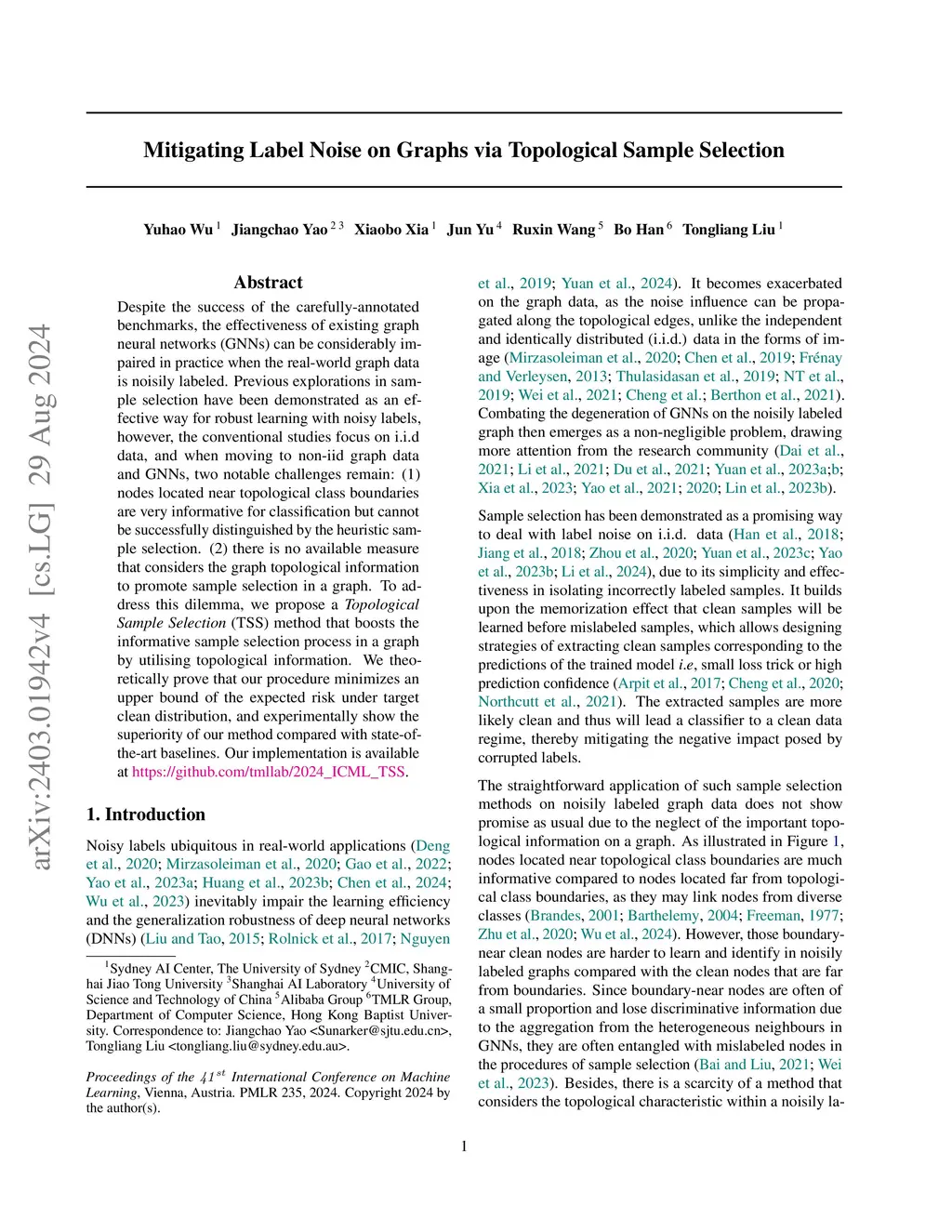 Despite the success of the carefully-annotated benchmarks, the effectiveness of existing graph neural networks (GNNs) can be considerably impaired in practice when the real-world graph data is noisily labeled. Previous explorations in sample selection have been demonstrated as an effective way for robust learning with noisy labels, however, the conventional studies focus on i.i.d data, and when moving to non-iid graph data and GNNs, two notable challenges remain: (1) nodes located near topological class boundaries are very informative for classification but cannot be successfully distinguished by the heuristic sample selection. (2) there is no available measure that considers the graph topological information to promote sample selection in a graph. To address this dilemma, we propose a (TSS) method that boosts the informative sample selection process in a graph by utilising topological information. We theoretically prove that our procedure minimizes an upper bound of the expected risk under target clean distribution, and experimentally show the superiority of our method compared with state-of-the-art baselines.