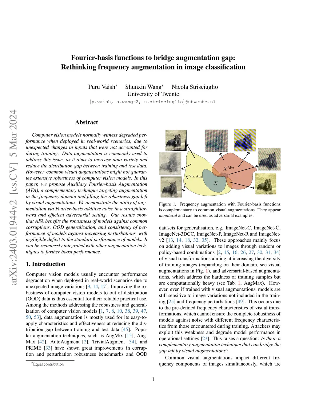 Computer vision models normally witness degraded performance when deployed in real-world scenarios, due to unexpected changes in inputs that were not accounted for during training. Data augmentation is commonly used to address this issue, as it aims to increase data variety and reduce the distribution gap between training and test data. However, common visual augmentations might not guarantee extensive robustness of computer vision models. In this paper, we propose Auxiliary Fourier-basis Augmentation (AFA), a complementary technique targeting augmentation in the frequency domain and filling the augmentation gap left by visual augmentations. We demonstrate the utility of augmentation via Fourier-basis additive noise in a straightforward and efficient adversarial setting. Our results show that AFA benefits the robustness of models against common corruptions, OOD generalization, and consistency of performance of models against increasing perturbations, with negligible deficit to the standard performance of models. It can be seamlessly integrated with other augmentation techniques to further boost performance. Code and models can be found at: https://github.com/nis-research/afa-augment