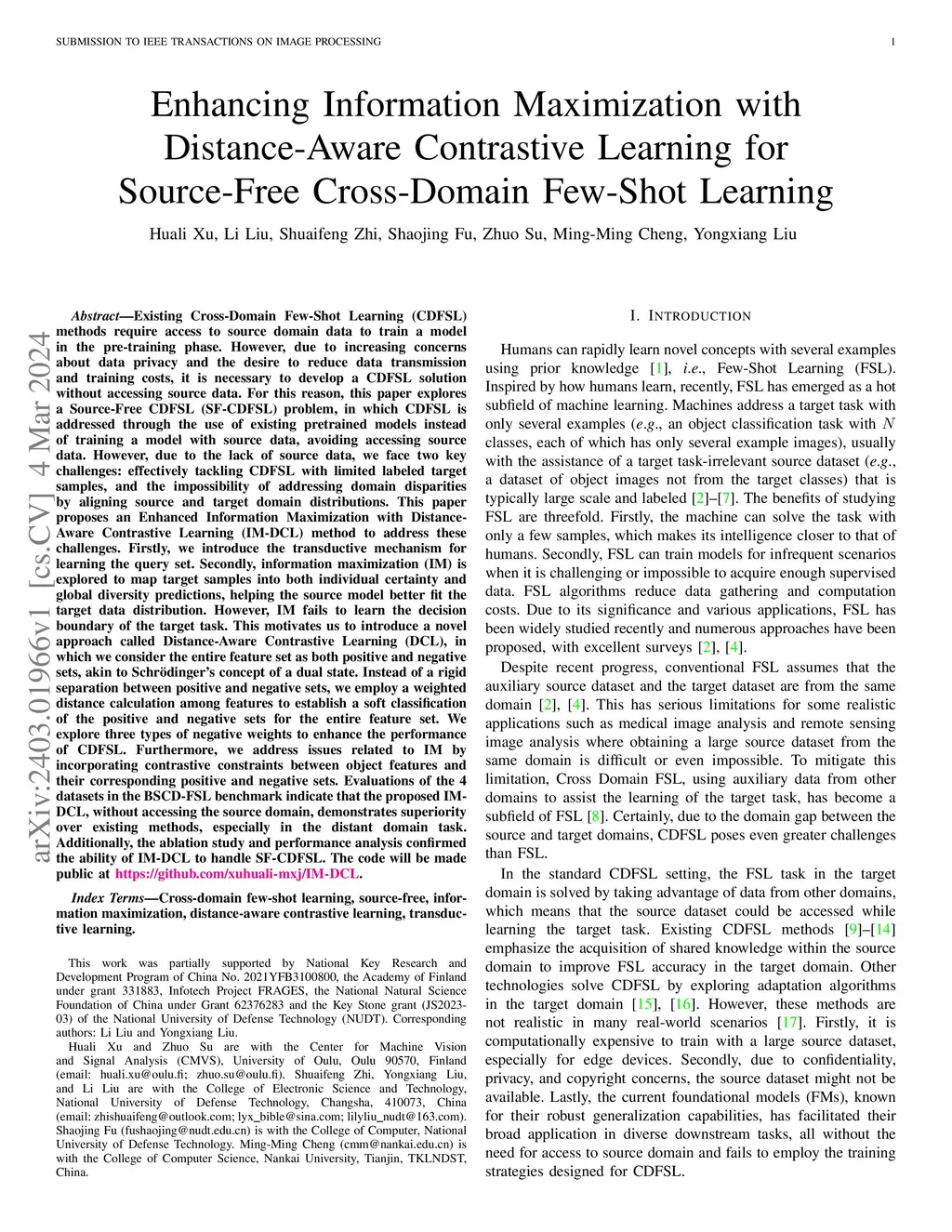 Existing Cross-Domain Few-Shot Learning (CDFSL) methods require access to source domain data to train a model in the pre-training phase. However, due to increasing concerns about data privacy and the desire to reduce data transmission and training costs, it is necessary to develop a CDFSL solution without accessing source data. For this reason, this paper explores a Source-Free CDFSL (SF-CDFSL) problem, in which CDFSL is addressed through the use of existing pretrained models instead of training a model with source data, avoiding accessing source data. This paper proposes an Enhanced Information Maximization with Distance-Aware Contrastive Learning (IM-DCL) method to address these challenges. Firstly, we introduce the transductive mechanism for learning the query set. Secondly, information maximization (IM) is explored to map target samples into both individual certainty and global diversity predictions, helping the source model better fit the target data distribution. However, IM fails to learn the decision boundary of the target task. This motivates us to introduce a novel approach called Distance-Aware Contrastive Learning (DCL), in which we consider the entire feature set as both positive and negative sets, akin to Schrodinger's concept of a dual state. Instead of a rigid separation between positive and negative sets, we employ a weighted distance calculation among features to establish a soft classification of the positive and negative sets for the entire feature set. Furthermore, we address issues related to IM by incorporating contrastive constraints between object features and their corresponding positive and negative sets. Evaluations of the 4 datasets in the BSCD-FSL benchmark indicate that the proposed IM-DCL, without accessing the source domain, demonstrates superiority over existing methods, especially in the distant domain task.