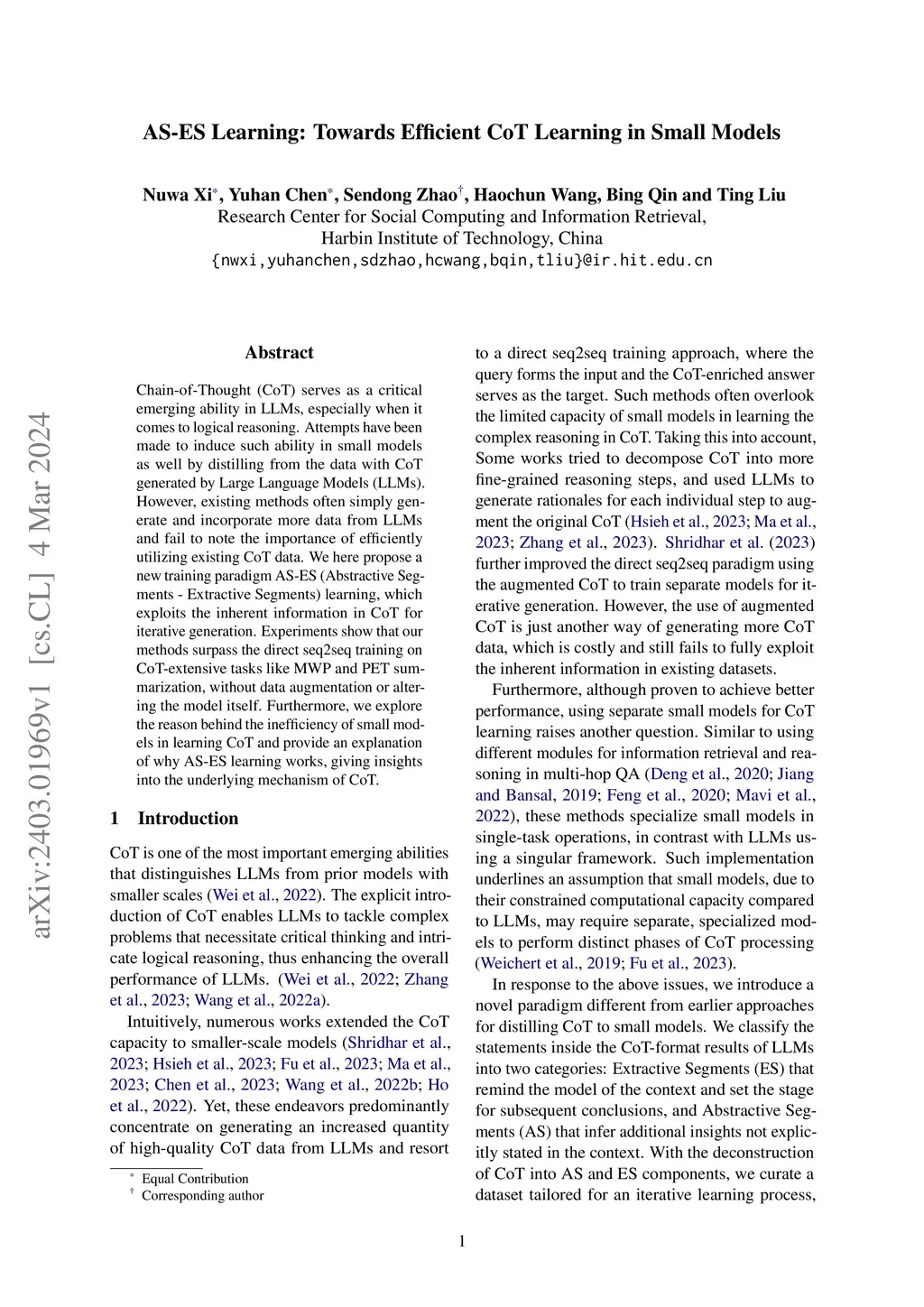 Chain-of-Thought (CoT) serves as a critical emerging ability in LLMs, especially when it comes to logical reasoning. Attempts have been made to induce such ability in small models as well by distilling from the data with CoT generated by Large Language Models (LLMs). However, existing methods often simply generate and incorporate more data from LLMs and fail to note the importance of efficiently utilizing existing CoT data. We here propose a new training paradigm AS-ES (Abstractive Segments - Extractive Segments) learning, which exploits the inherent information in CoT for iterative generation. Experiments show that our methods surpass the direct seq2seq training on CoT-extensive tasks like MWP and PET summarization, without data augmentation or altering the model itself. Furthermore, we explore the reason behind the inefficiency of small models in learning CoT and provide an explanation of why AS-ES learning works, giving insights into the underlying mechanism of CoT.