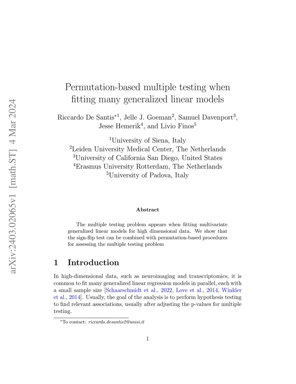 The multiple testing problem appears when fitting multivariate generalized linear models for high dimensional data. We show that the sign-flip test can be combined with permutation-based procedures for assessing the multiple testing problem