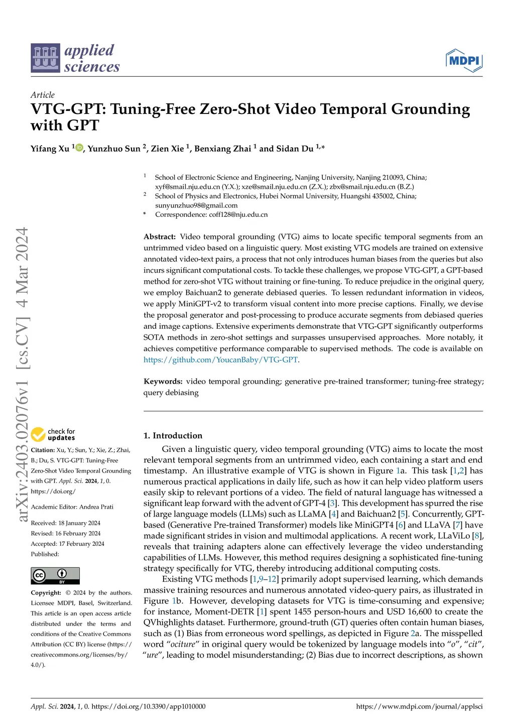 Video temporal grounding (VTG) aims to locate specific temporal segments from an untrimmed video based on a linguistic query. Most existing VTG models are trained on extensive annotated video-text pairs, a process that not only introduces human biases from the queries but also incurs significant computational costs. To tackle these challenges, we propose VTG-GPT, a GPT-based method for zero-shot VTG without training or fine-tuning. To reduce prejudice in the original query, we employ Baichuan2 to generate debiased queries. To lessen redundant information in videos, we apply MiniGPT-v2 to transform visual content into more precise captions. Finally, we devise the proposal generator and post-processing to produce accurate segments from debiased queries and image captions. Extensive experiments demonstrate that VTG-GPT significantly outperforms SOTA methods in zero-shot settings and surpasses unsupervised approaches. More notably, it achieves competitive performance comparable to supervised methods. The code is available on https://github.com/YoucanBaby/VTG-GPT