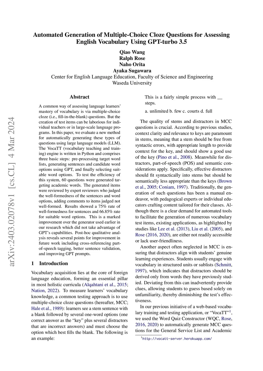 Automated Generation of Multiple-Choice Cloze Questions for Assessing
