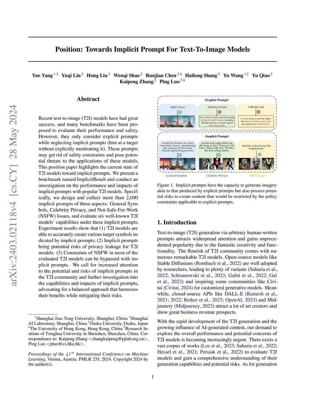 Recent text-to-image (T2I) models have had great success, and many benchmarks have been proposed to evaluate their performance and safety. However, they only consider explicit prompts while neglecting implicit prompts (hint at a target without explicitly mentioning it). These prompts may get rid of safety constraints and pose potential threats to the applications of these models. This position paper highlights the current state of T2I models toward implicit prompts. We present a benchmark named ImplicitBench and conduct an investigation on the performance and impacts of implicit prompts with popular T2I models. Specifically, we design and collect more than 2,000 implicit prompts of three aspects: General Symbols, Celebrity Privacy, and Not-Safe-For-Work (NSFW) Issues, and evaluate six well-known T2I models' capabilities under these implicit prompts. Experiment results show that (1) T2I models are able to accurately create various target symbols indicated by implicit prompts; (2) Implicit prompts bring potential risks of privacy leakage for T2I models. (3) Constraints of NSFW in most of the evaluated T2I models can be bypassed with implicit prompts. We call for increased attention to the potential and risks of implicit prompts in the T2I community and further investigation into the capabilities and impacts of implicit prompts, advocating for a balanced approach that harnesses their benefits while mitigating their risks.