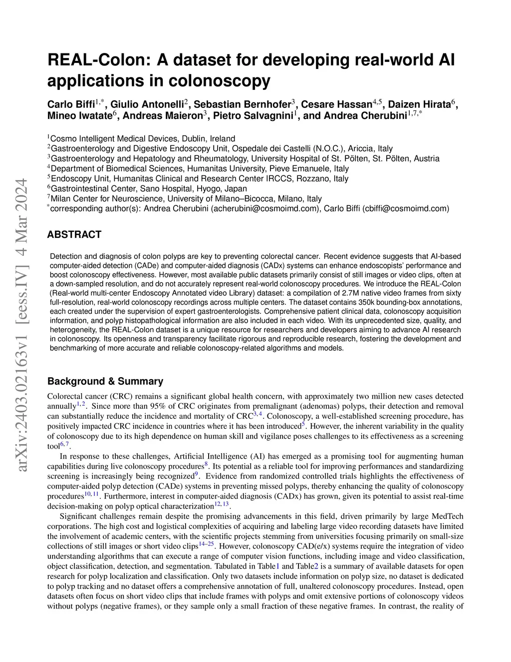 Detection and diagnosis of colon polyps are key to preventing colorectal cancer. Recent evidence suggests that AI-based computer-aided detection (CADe) and computer-aided diagnosis (CADx) systems can enhance endoscopists' performance and boost colonoscopy effectiveness. However, most available public datasets primarily consist of still images or video clips, often at a down-sampled resolution, and do not accurately represent real-world colonoscopy procedures. We introduce the REAL-Colon (Real-world multi-center Endoscopy Annotated video Library) dataset: a compilation of 2.7M native video frames from sixty full-resolution, real-world colonoscopy recordings across multiple centers. The dataset contains 350k bounding-box annotations, each created under the supervision of expert gastroenterologists. Comprehensive patient clinical data, colonoscopy acquisition information, and polyp histopathological information are also included in each video. With its unprecedented size, quality, and heterogeneity, the REAL-Colon dataset is a unique resource for researchers and developers aiming to advance AI research in colonoscopy. Its openness and transparency facilitate rigorous and reproducible research, fostering the development and benchmarking of more accurate and reliable colonoscopy-related algorithms and models.