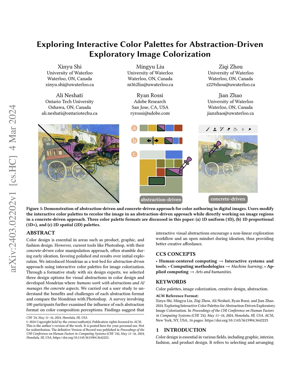Color design is essential in areas such as product, graphic, and fashion design. However, current tools like Photoshop, with their concrete-driven color manipulation approach, often stumble during early ideation, favoring polished end results over initial exploration. We introduced Mondrian as a test-bed for abstraction-driven approach using interactive color palettes for image colorization. Through a formative study with six design experts, we selected three design options for visual abstractions in color design and developed Mondrian where humans work with abstractions and AI manages the concrete aspects. We carried out a user study to understand the benefits and challenges of each abstraction format and compare the Mondrian with Photoshop. A survey involving 100 participants further examined the influence of each abstraction format on color composition perceptions. Findings suggest that interactive visual abstractions encourage a non-linear exploration workflow and an open mindset during ideation, thus providing better creative affordance.