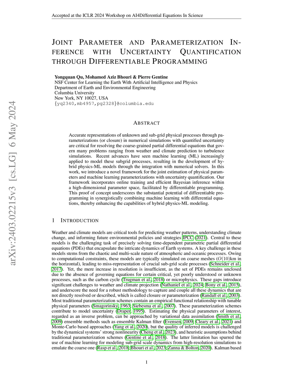 Accurate representations of unknown and sub-grid physical processes through parameterizations (or closure) in numerical simulations with quantified uncertainty are critical for resolving the coarse-grained partial differential equations that govern many problems ranging from weather and climate prediction to turbulence simulations. Recent advances have seen machine learning (ML) increasingly applied to model these subgrid processes, resulting in the development of hybrid physics-ML models through the integration with numerical solvers. In this work, we introduce a novel framework for the joint estimation of physical parameters and machine learning parameterizations with uncertainty quantification. Our framework incorporates online training and efficient Bayesian inference within a high-dimensional parameter space, facilitated by differentiable programming. This proof of concept underscores the substantial potential of differentiable programming in synergistically combining machine learning with differential equations, thereby enhancing the capabilities of hybrid physics-ML modeling.