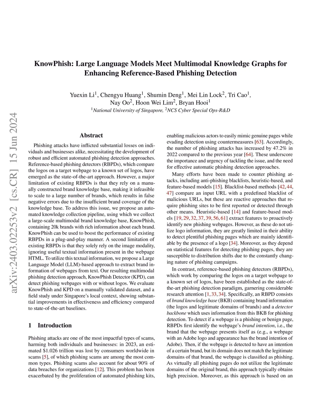 Phishing attacks have inflicted substantial losses on individuals and businesses alike, necessitating the development of robust and efficient automated phishing detection approaches. Reference-based phishing detectors (RBPDs), which compare the logos on a target webpage to a known set of logos, have emerged as the state-of-the-art approach. However, a major limitation of existing RBPDs is that they rely on a manually constructed brand knowledge base, making it infeasible to scale to a large number of brands, which results in false negative errors due to the insufficient brand coverage of the knowledge base. To address this issue, we propose an automated knowledge collection pipeline, using which we collect a large-scale multimodal brand knowledge base, KnowPhish, containing 20k brands with rich information about each brand. KnowPhish can be used to boost the performance of existing RBPDs in a plug-and-play manner. A second limitation of existing RBPDs is that they solely rely on the image modality, ignoring useful textual information present in the webpage HTML. To utilize this textual information, we propose a Large Language Model (LLM)-based approach to extract brand information of webpages from text. Our resulting multimodal phishing detection approach, KnowPhish Detector (KPD), can detect phishing webpages with or without logos. We evaluate KnowPhish and KPD on a manually validated dataset, and a field study under Singapore's local context, showing substantial improvements in effectiveness and efficiency compared to state-of-the-art baselines.
