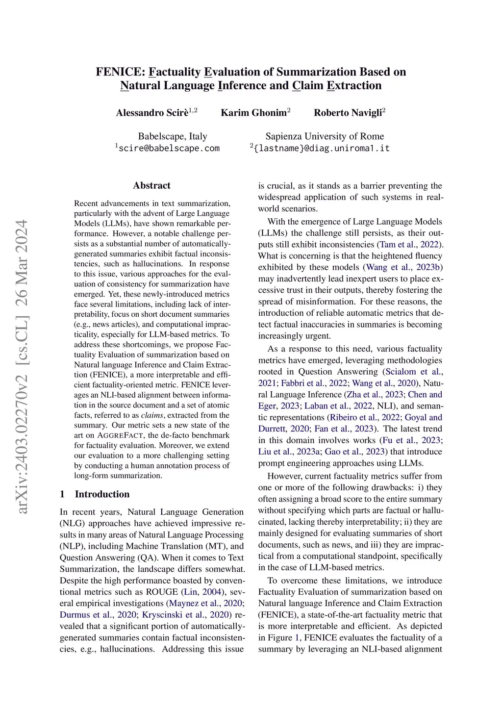 Recent advancements in text summarization, particularly with the advent of Large Language Models (LLMs), have shown remarkable performance. However, a notable challenge persists as a substantial number of automatically-generated summaries exhibit factual inconsistencies, such as hallucinations. In response to this issue, various approaches for the evaluation of consistency for summarization have emerged. Yet, these newly-introduced metrics face several limitations, including lack of interpretability, focus on short document summaries (e.g., news articles), and computational impracticality, especially for LLM-based metrics. To address these shortcomings, we propose Factuality Evaluation of summarization based on Natural language Inference and Claim Extraction (FENICE), a more interpretable and efficient factuality-oriented metric. FENICE leverages an NLI-based alignment between information in the source document and a set of atomic facts, referred to as claims, extracted from the summary. Our metric sets a new state of the art on AGGREFACT, the de-facto benchmark for factuality evaluation. Moreover, we extend our evaluation to a more challenging setting by conducting a human annotation process of long-form summarization.