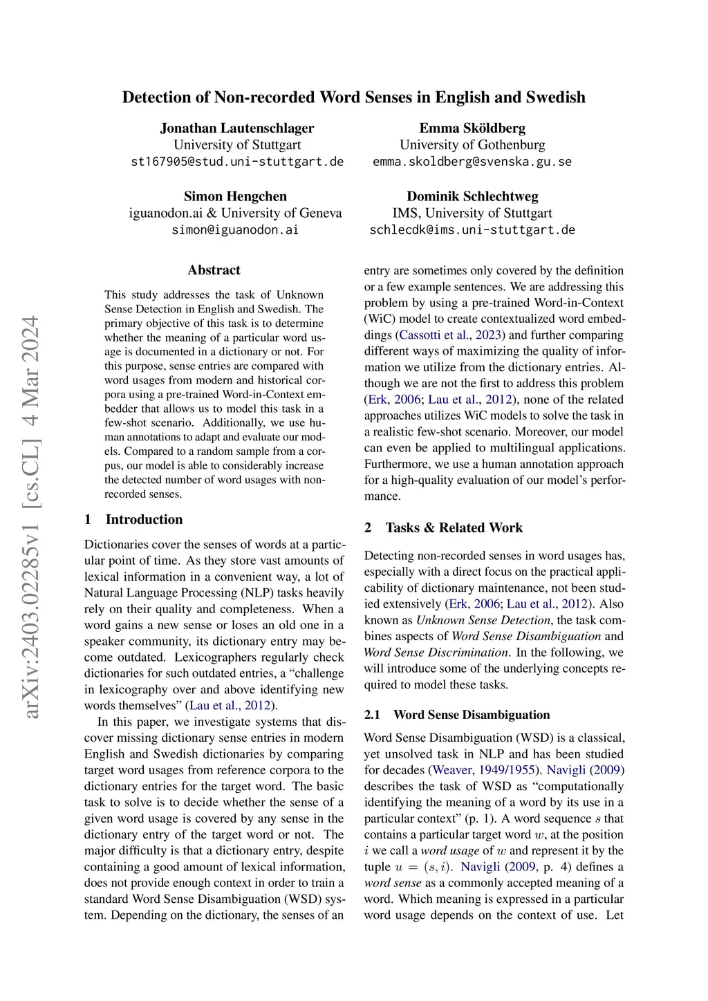 Detection of Non-recorded Word Senses in English and Swedish