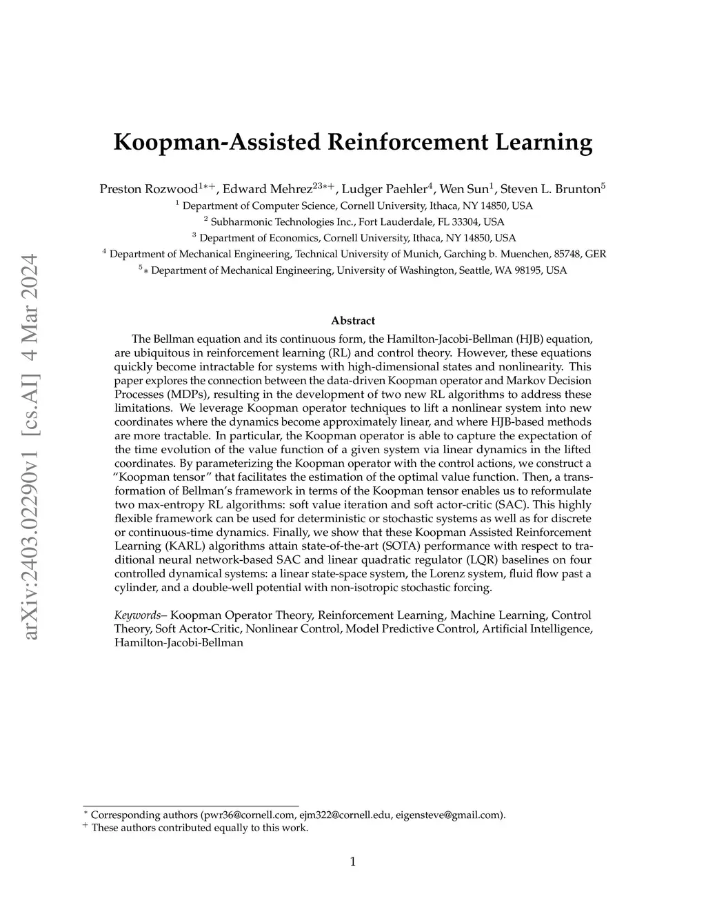 The Bellman equation and its continuous form, the Hamilton-Jacobi-Bellman (HJB) equation, are ubiquitous in reinforcement learning (RL) and control theory. However, these equations quickly become intractable for systems with high-dimensional states and nonlinearity. This paper explores the connection between the data-driven Koopman operator and Markov Decision Processes (MDPs), resulting in the development of two new RL algorithms to address these limitations. We leverage Koopman operator techniques to lift a nonlinear system into new coordinates where the dynamics become approximately linear, and where HJB-based methods are more tractable. In particular, the Koopman operator is able to capture the expectation of the time evolution of the value function of a given system via linear dynamics in the lifted coordinates. By parameterizing the Koopman operator with the control actions, we construct a ``Koopman tensor'' that facilitates the estimation of the optimal value function. Then, a transformation of Bellman's framework in terms of the Koopman tensor enables us to reformulate two max-entropy RL algorithms: soft value iteration and soft actor-critic (SAC). This highly flexible framework can be used for deterministic or stochastic systems as well as for discrete or continuous-time dynamics. Finally, we show that these Koopman Assisted Reinforcement Learning (KARL) algorithms attain state-of-the-art (SOTA) performance with respect to traditional neural network-based SAC and linear quadratic regulator (LQR) baselines on four controlled dynamical systems: a linear state-space system, the Lorenz system, fluid flow past a cylinder, and a double-well potential with non-isotropic stochastic forcing.