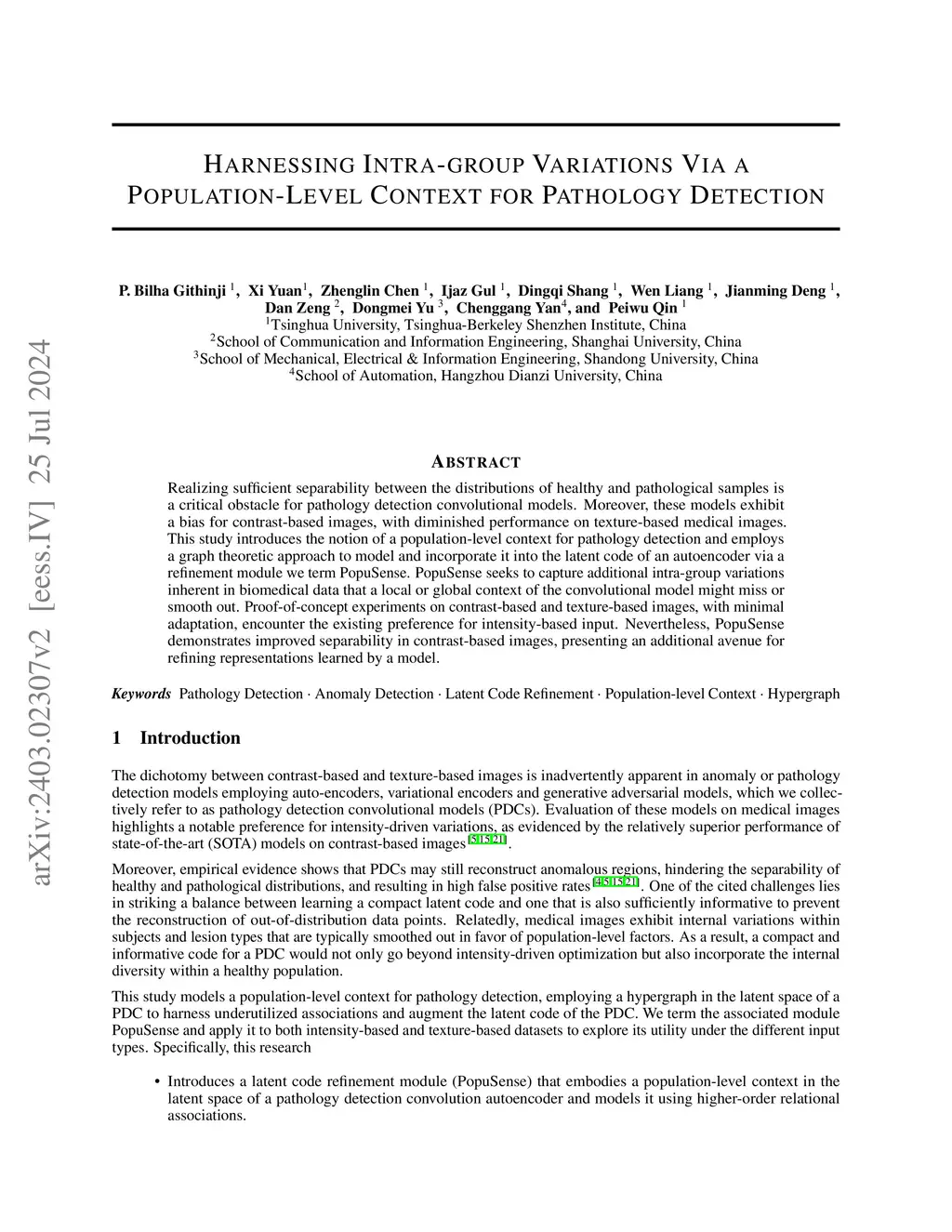 Realizing sufficient separability between the distributions of healthy and pathological samples is a critical obstacle for pathology detection convolutional models. Moreover, these models exhibit a bias for contrast-based images, with diminished performance on texture-based medical images. This study introduces the notion of a population-level context for pathology detection and employs a graph theoretic approach to model and incorporate it into the latent code of an autoencoder via a refinement module we term PopuSense. PopuSense seeks to capture additional intra-group variations inherent in biomedical data that a local or global context of the convolutional model might miss or smooth out. Experiments on contrast-based and texture-based images, with minimal adaptation, encounter the existing preference for intensity-based input. Nevertheless, PopuSense demonstrates improved separability in contrast-based images, presenting an additional avenue for refining representations learned by a model.