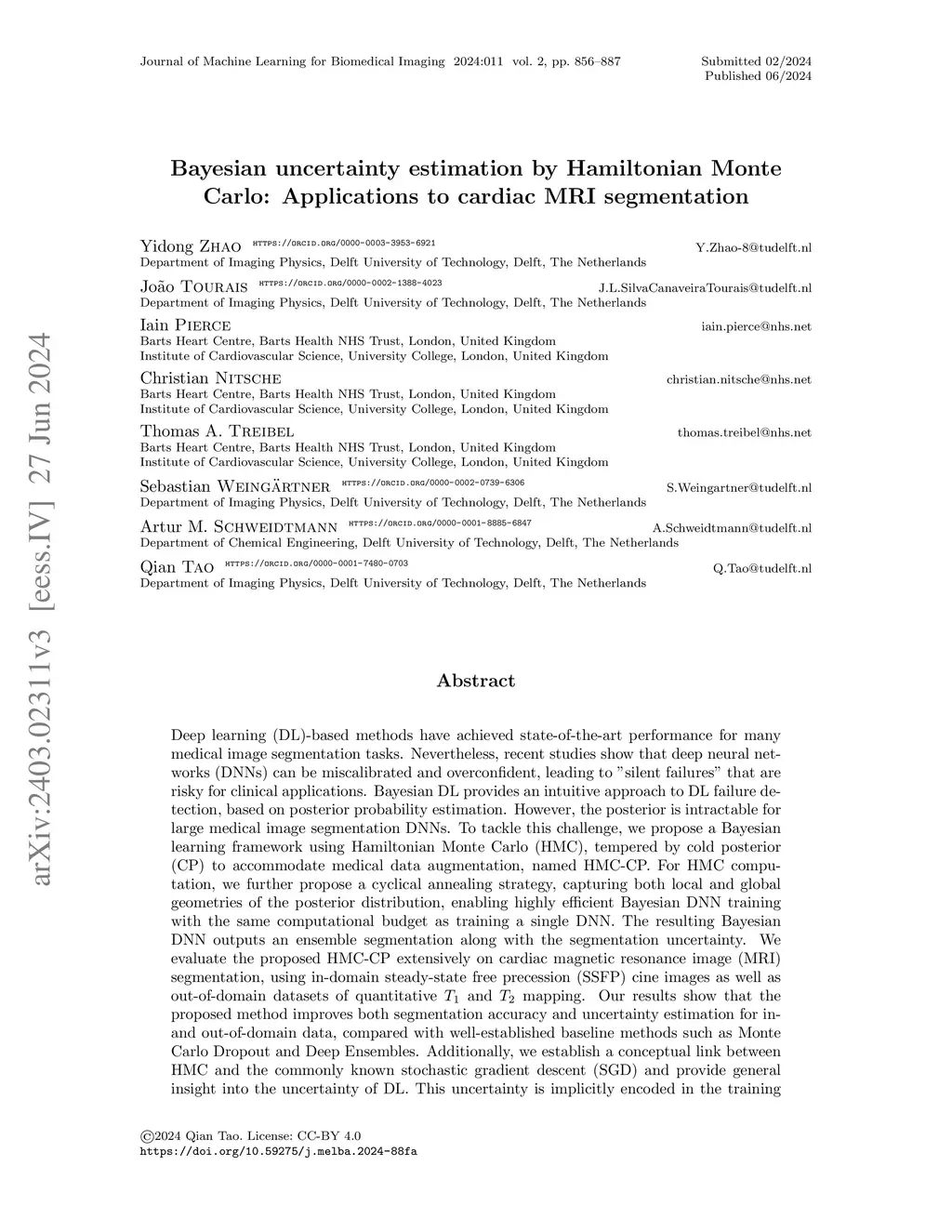 Deep learning (DL)-based methods have achieved state-of-the-art performance for many medical image segmentation tasks. Nevertheless, recent studies show that deep neural networks (DNNs) can be miscalibrated and overconfident, leading to "silent failures" that are risky for clinical applications. Bayesian DL provides an intuitive approach to DL failure detection, based on posterior probability estimation. However, the posterior is intractable for large medical image segmentation DNNs. To tackle this challenge, we propose a Bayesian learning framework using Hamiltonian Monte Carlo (HMC), tempered by cold posterior (CP) to accommodate medical data augmentation, named HMC-CP. For HMC computation, we further propose a cyclical annealing strategy, capturing both local and global geometries of the posterior distribution, enabling highly efficient Bayesian DNN training with the same computational budget as training a single DNN. The resulting Bayesian DNN outputs an ensemble segmentation along with the segmentation uncertainty. We evaluate the proposed HMC-CP extensively on cardiac magnetic resonance image (MRI) segmentation, using in-domain steady-state free precession (SSFP) cine images as well as out-of-domain datasets of quantitative T1 and T2 mapping. Our results show that the proposed method improves both segmentation accuracy and uncertainty estimation for in- and out-of-domain data, compared with well-established baseline methods such as Monte Carlo Dropout and Deep Ensembles. Additionally, we establish a conceptual link between HMC and the commonly known stochastic gradient descent (SGD) and provide general insight into the uncertainty of DL. This uncertainty is implicitly encoded in the training dynamics but often overlooked. With reliable uncertainty estimation, our method provides a promising direction toward trustworthy DL in clinical applications.
