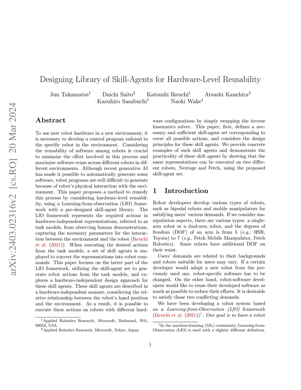 To use new robot hardware in a new environment, it is necessary to develop a control program tailored to that specific robot in that environment. Considering the reusability of software among robots is crucial to minimize the effort involved in this process and maximize software reuse across different robots in different environments. This paper proposes a method to remedy this process by considering hardware-level reusability, using Learning-from-observation (LfO) paradigm with a pre-designed skill-agent library. The LfO framework represents the required actions in hardware-independent representations, referred to as task models, from observing human demonstrations, capturing the necessary parameters for the interaction between the environment and the robot. When executing the desired actions from the task models, a set of skill agents is employed to convert the representations into robot commands. This paper focuses on the latter part of the LfO framework, utilizing the set to generate robot actions from the task models, and explores a hardware-independent design approach for these skill agents. These skill agents are described in a hardware-independent manner, considering the relative relationship between the robot's hand position and the environment. As a result, it is possible to execute these actions on robots with different hardware configurations by simply swapping the inverse kinematics solver. This paper, first, defines a necessary and sufficient skill-agent set corresponding to cover all possible actions, and considers the design principles for these skill agents in the library. We provide concrete examples of such skill agents and demonstrate the practicality of using these skill agents by showing that the same representations can be executed on two different robots, Nextage and Fetch, using the proposed skill-agents set.