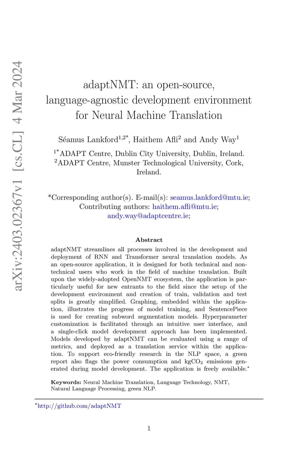 adaptNMT streamlines all processes involved in the development and deployment of RNN and Transformer neural translation models. As an open-source application, it is designed for both technical and non-technical users who work in the field of machine translation. Built upon the widely-adopted OpenNMT ecosystem, the application is particularly useful for new entrants to the field since the setup of the development environment and creation of train, validation and test splits is greatly simplified. Graphing, embedded within the application, illustrates the progress of model training, and SentencePiece is used for creating subword segmentation models. Hyperparameter customization is facilitated through an intuitive user interface, and a single-click model development approach has been implemented. Models developed by adaptNMT can be evaluated using a range of metrics, and deployed as a translation service within the application. To support eco-friendly research in the NLP space, a green report also flags the power consumption and kgCO emissions generated during model development. The application is freely available.