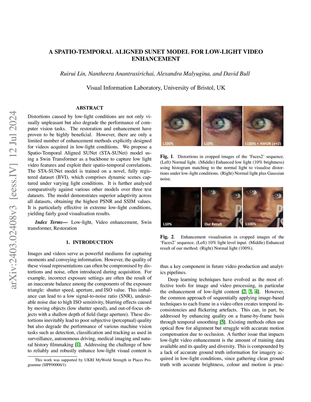 Distortions caused by low-light conditions are not only visually unpleasant but also degrade the performance of computer vision tasks. The restoration and enhancement have proven to be highly beneficial. However, there are only a limited number of enhancement methods explicitly designed for videos acquired in low-light conditions. We propose a Spatio-Temporal Aligned SUNet (STA-SUNet) model using a Swin Transformer as a backbone to capture low light video features and exploit their spatio-temporal correlations. The STA-SUNet model is trained on a novel, fully registered dataset (BVI), which comprises dynamic scenes captured under varying light conditions. It is further analysed comparatively against various other models over three test datasets. The model demonstrates superior adaptivity across all datasets, obtaining the highest PSNR and SSIM values. It is particularly effective in extreme low-light conditions, yielding fairly good visualisation results.