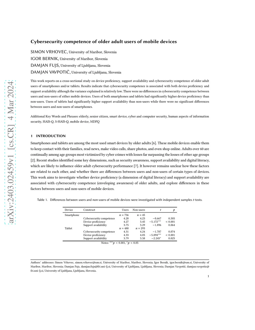 This work reports on a cross-sectional study on device proficiency, support availability and cybersecurity competence of older adult users of smartphones and/or tablets. Results indicate that cybersecurity competence is associated with both device proficiency and support availability although the variance explained is relatively low. There were no differences in cybersecurity competence between users and non-users of either mobile devices. Users of both smartphones and tablets had significantly higher device proficiency than non-users. Users of tablets had significantly higher support availability than non-users while there were no significant differences between users and non-users of smartphones.