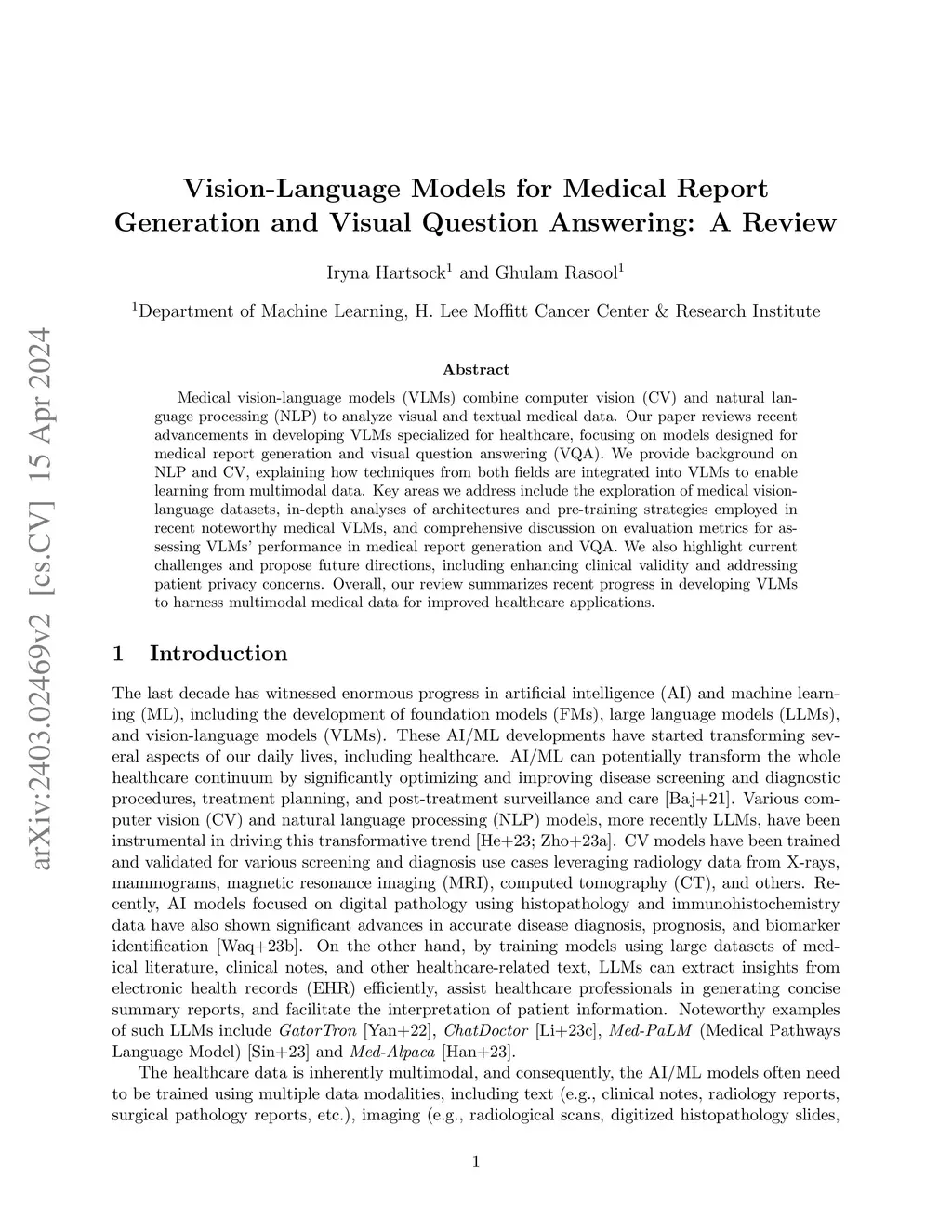 Medical vision-language models (VLMs) combine computer vision (CV) and natural language processing (NLP) to analyze visual and textual medical data. Our paper reviews recent advancements in developing VLMs specialized for healthcare, focusing on models designed for medical report generation and visual question answering (VQA). We provide background on NLP and CV, explaining how techniques from both fields are integrated into VLMs to enable learning from multimodal data. Key areas we address include the exploration of medical vision-language datasets, in-depth analyses of architectures and pre-training strategies employed in recent noteworthy medical VLMs, and comprehensive discussion on evaluation metrics for assessing VLMs' performance in medical report generation and VQA. We also highlight current challenges and propose future directions, including enhancing clinical validity and addressing patient privacy concerns. Overall, our review summarizes recent progress in developing VLMs to harness multimodal medical data for improved healthcare applications.