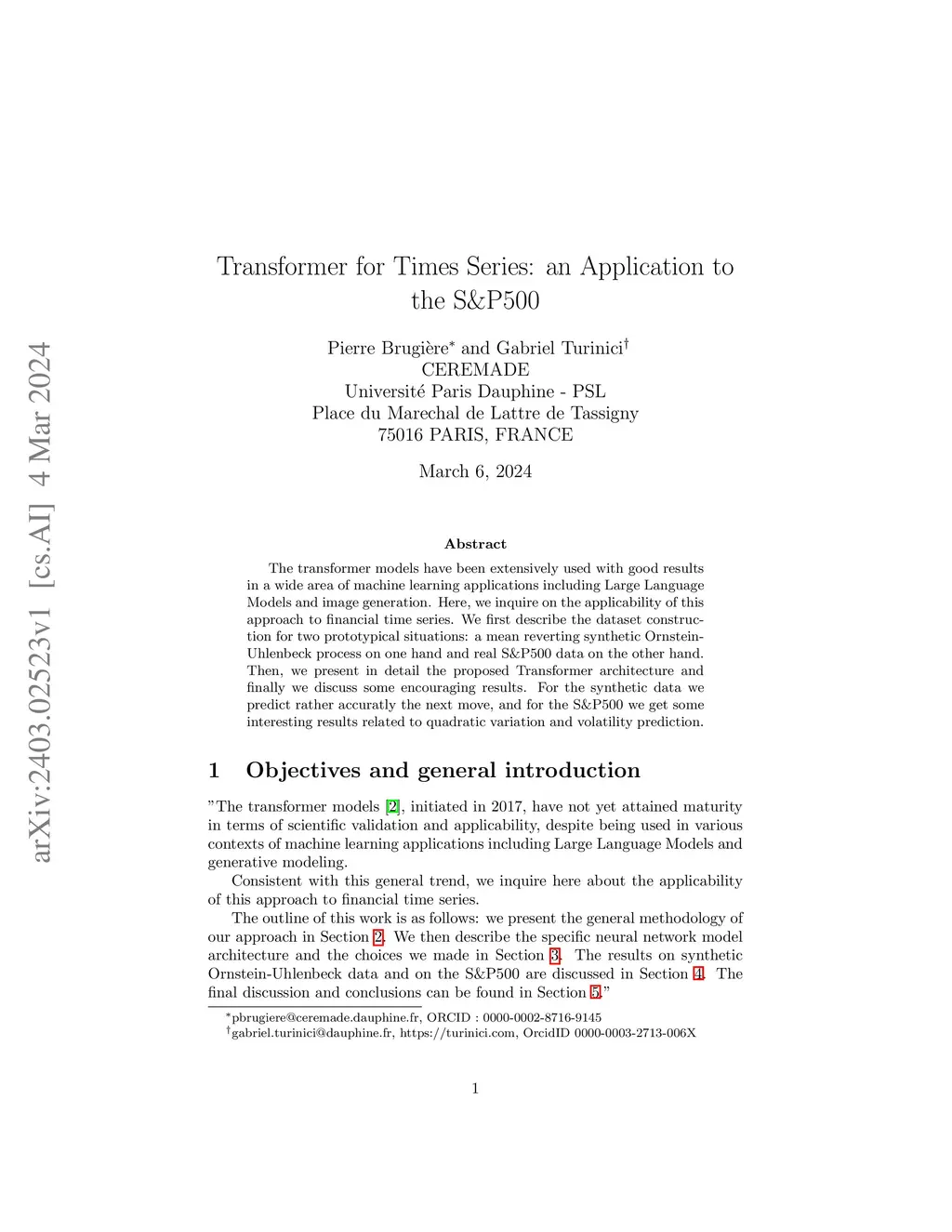 Transformer for Times Series: an Application to the S&P500