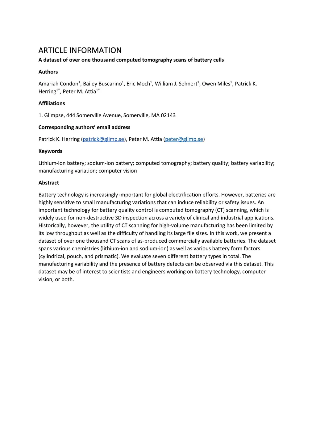 Battery technology is increasingly important for global electrification efforts. However, batteries are highly sensitive to small manufacturing variations that can induce reliability or safety issues. An important technology for battery quality control is computed tomography (CT) scanning, which is widely used for non-destructive 3D inspection across a variety of clinical and industrial applications. Historically, however, the utility of CT scanning for high-volume manufacturing has been limited by its low throughput as well as the difficulty of handling its large file sizes. In this work, we present a dataset of over one thousand CT scans of as-produced commercially available batteries. The dataset spans various chemistries (lithium-ion and sodium-ion) as well as various battery form factors (cylindrical, pouch, and prismatic). We evaluate seven different battery types in total. The manufacturing variability and the presence of battery defects can be observed via this dataset. This dataset may be of interest to scientists and engineers working on battery technology, computer vision, or both.