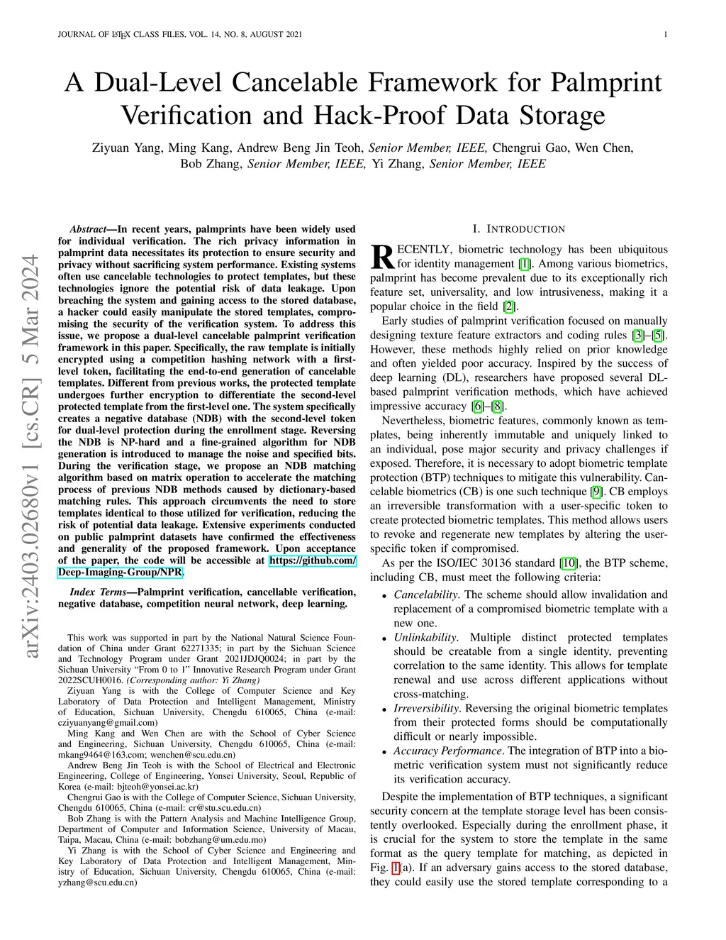 A Dual-Level Cancelable Framework for Palmprint Verification and