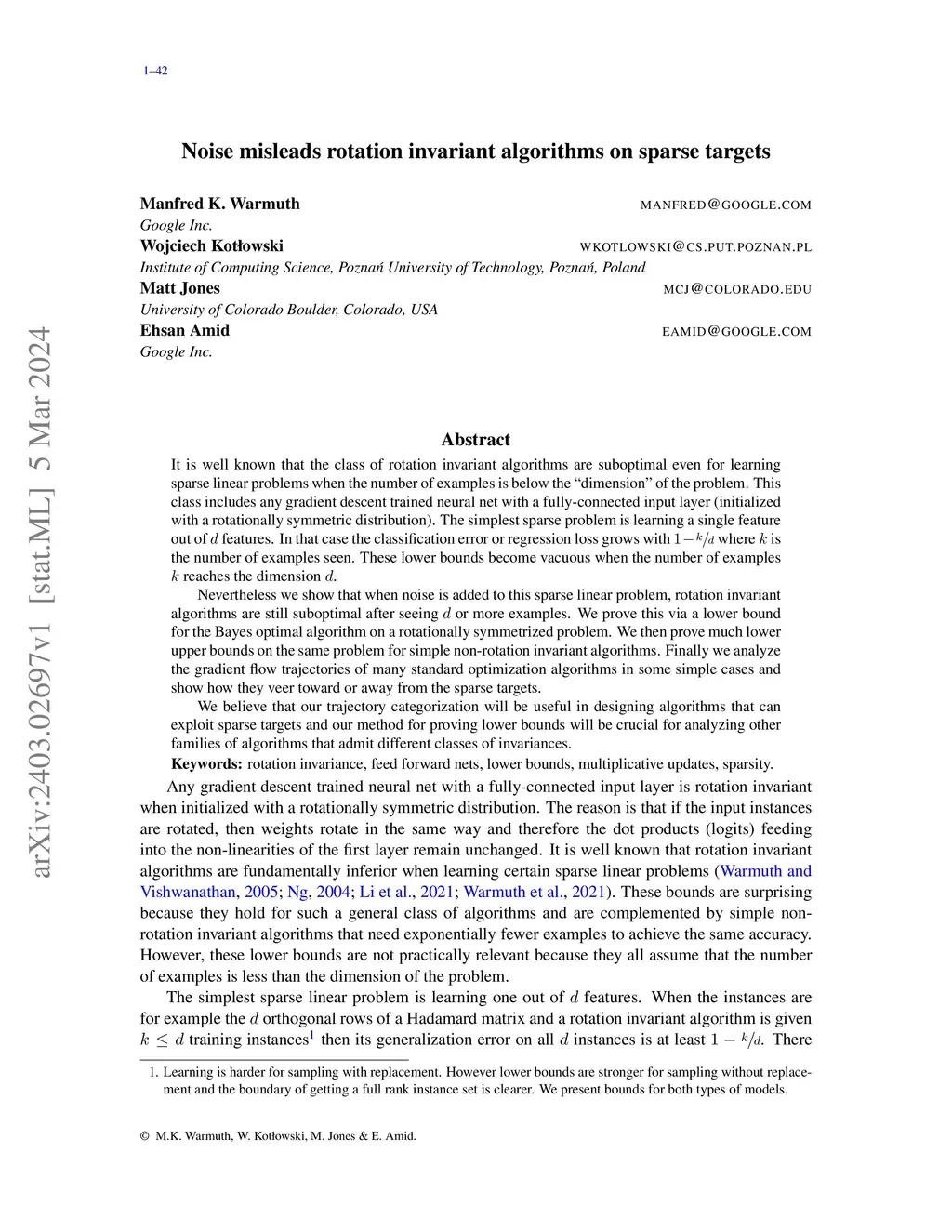 It is well known that the class of rotation invariant algorithms are suboptimal even for learning sparse linear problems when the number of examples is below the "dimension" of the problem. This class includes any gradient descent trained neural net with a fully-connected input layer (initialized with a rotationally symmetric distribution). The simplest sparse problem is learning a single feature out of features. In that case the classification error or regression loss grows with where is the number of examples seen. These lower bounds become vacuous when the number of examples reaches the dimension . We show that when noise is added to this sparse linear problem, rotation invariant algorithms are still suboptimal after seeing or more examples. We prove this via a lower bound for the Bayes optimal algorithm on a rotationally symmetrized problem. We then prove much lower upper bounds on the same problem for simple non-rotation invariant algorithms. Finally we analyze the gradient flow trajectories of many standard optimization algorithms in some simple cases and show how they veer toward or away from the sparse targets. We believe that our trajectory categorization will be useful in designing algorithms that can exploit sparse targets and our method for proving lower bounds will be crucial for analyzing other families of algorithms that admit different classes of invariances.
